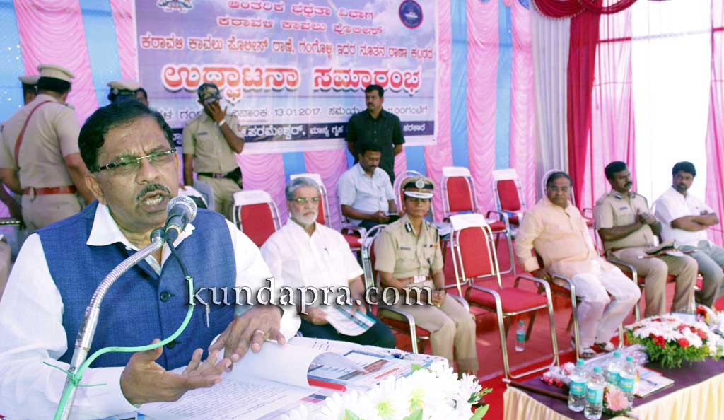 ಗಂಗೊಳ್ಳಿ ಮೀನುಗಾರಿಗಾ ಬಂದರು ಪ್ರದೇಶಲ್ಲಿ ರೂ ೪೮ ಲಕ್ಷ ವೆಚ್ಚದಲ್ಲಿ ನಿರ್ಮಿಸಿರುವ ಕಾವಲು ಪೊಲೀಸ್ ಠಾಣೆಯನ್ನು ಉದ್ಘಾಟಿಸಿದ ಬಳಿಕ ನಡೆದ ಸಭೆಯಲ್ಲಿ ಅವರು ಮಾತನಾಡಿದರು. ಕರಾವಳಿ ಪೊಲೀಸ್ ಪಡೆಗೆ ಹಲವು ಜವಾಬ್ದಾರಿಗಳಿವೆ. ಕಡಲಿನಲ್ಲಿ ಅಪಾಯಕ್ಕೆ ಈಡಾಗುವ ಮೀನುಗಾರರ ಮತ್ತು ಬೋಟ್ಗಳ ರಕ್ಷಣೆ, ನುಸುಳಿ ಬರುವ ಭಯೋತ್ಪಾದಕರ, ಕಳ್ಳ ಸಾಗಣೆದಾರರ ಪತ್ತೆ ಮತ್ತು ಸಮುದ್ರ ಹಾಗೂ ಕರಾವಳಿ ಅಂಚಿನಲ್ಲಿ ನಡೆಯುವ ಕಾನೂನು ಬಾಹಿರ ಚಟುವಟಿಕೆಗಳ ತಡೆ ಅದರ ಹೊಣೆ. ಇದಕ್ಕಾಗಿ ಅದಕ್ಕೆ ಎಲ್ಲ ಆಧುನಿಕ ಸಲಕರಣೆಗಳನ್ನು ಒದಗಿಸಲಾಗುತ್ತಿದೆ ಎಂದು ಅವರು ಹೇಳಿದರು.
