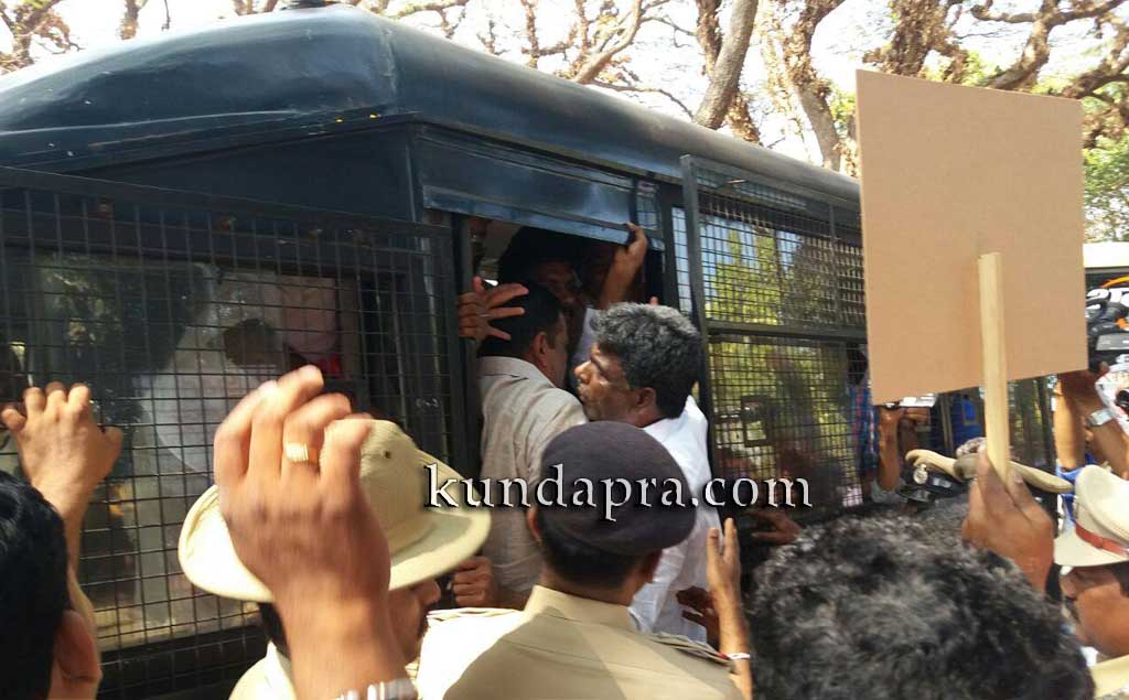 ಕುಂದಾಪುರ ಶಾಸ್ತ್ರೀವೃತ್ತದಿಂದ ಪ್ರತಿಭಟನಾ ಮೆರವಣಿಗೆಯಲ್ಲಿ ಸಾಗಿ ಮಿನಿ ವಿಧಾನಸೌಧ ಬಳಿ ತೆರಳುತ್ತಿದ್ದಂತೆ ಪೊಲೀಸರು ಪ್ರತಿಭಟನಾಕಾರರನ್ನು ತಡೆದರು. ಮಿನಿವಿಧಾನಸೌಧ ಪ್ರವೇಶಿಸದಂತೆ ಎರಡೂ ಗೇಟ್ಗಳನ್ನು ಮುಚ್ಚಿ ಕೋರ್ಟ್ ಆವರಣದಲ್ಲಿ ಬ್ಯಾರಿಕೇಡ್ ಹಾಕಲಾಗಿತ್ತು. ಪ್ರತಿಭಟನಾಕಾರರು ಮುನ್ನುಗ್ಗಲು ಪ್ರಯತ್ನಿಸುತ್ತಿದ್ದಂತೆ ಪ್ರತಿಭಟನೆ ನೇತೃತ್ವ ವಹಿಸಿದ್ದ ವಿಧಾನ ಪರಿಷತ್ ಸದಸ್ಯ ಕೋಟ ಶ್ರೀನಿವಾಸ ಪೂಜಾರಿ ಅವರನ್ನು ಪೊಲೀಸರು ಬಂಧಿಸಿ ಬಳಿಕ ಪ್ರತಿಭಟನೆಯ ನೇತೃತ್ವ ವಹಿಸಿದ್ದ ಇತರರನ್ನು ಬಂಧಿಸಿ ಸ್ವಲ್ಪ ಹೊತ್ತಿನ ಬಳಿಕ ಬಿಡುಗಡೆಗೊಳಿಸಲಾಯಿತು.