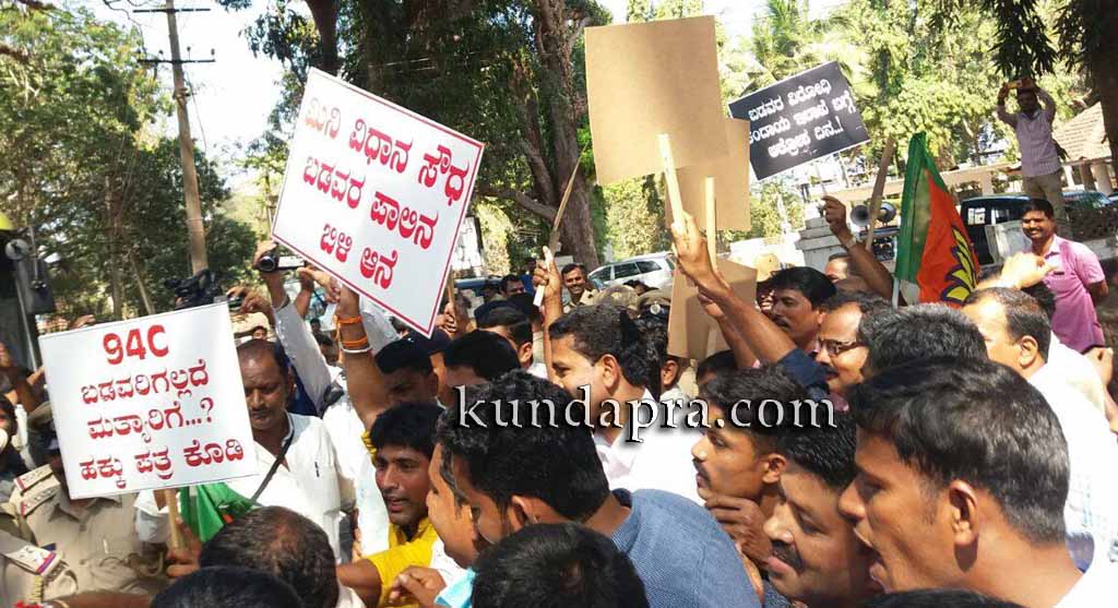 ಕುಂದಾಪುರ: 94ಸಿ ಫಲಾನುಭವಿಗಳಿಗೆ ಹಕ್ಕು ಪತ್ರ ನೀಡದೇ ವಿಳಂಬ ನೀತಿ ಅನುಸರಿಸುತ್ತಿರುವ ರಾಜ್ಯ ಸರಕಾರ ಹಾಗೂ ತಾಲೂಕು ಅಧಿಕಾರಿಗಳ ನಡೆಯನ್ನು ಖಂಡಿಸಿ ವಿಧಾನ ಪರಿಷತ್ ಸದಸ್ಯ ಕೋಟ ಶ್ರೀನಿವಾಸ ಪೂಜಾರಿ ಅವರ ನೇತೃತ್ವದಲ್ಲಿ ಇಲ್ಲಿನ ತಾಲೂಕು ಪಂಚಾಯತ್ ಎದುರು ಬೃಹತ್ ಸಾರ್ವಜನಿಕ ಸಭೆ ಹಾಗೂ ಕುಂದಾಪುರ ಶಾಸ್ತ್ರೀ ವೃತ್ತದಿಂದ ಪ್ರತಿಭಟನಾ ಮೆರವಣಿಗೆ, ವಿಧಾನಸೌಧ ಮುತ್ತಿಗೆಗೆ ಯತ್ನ ನಡೆಯಿತು.