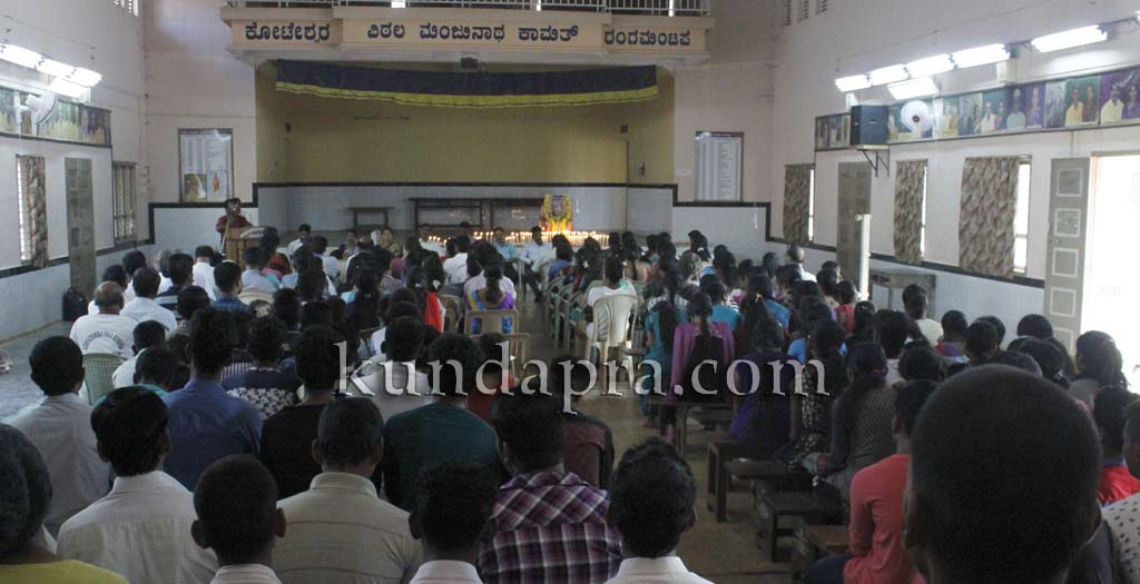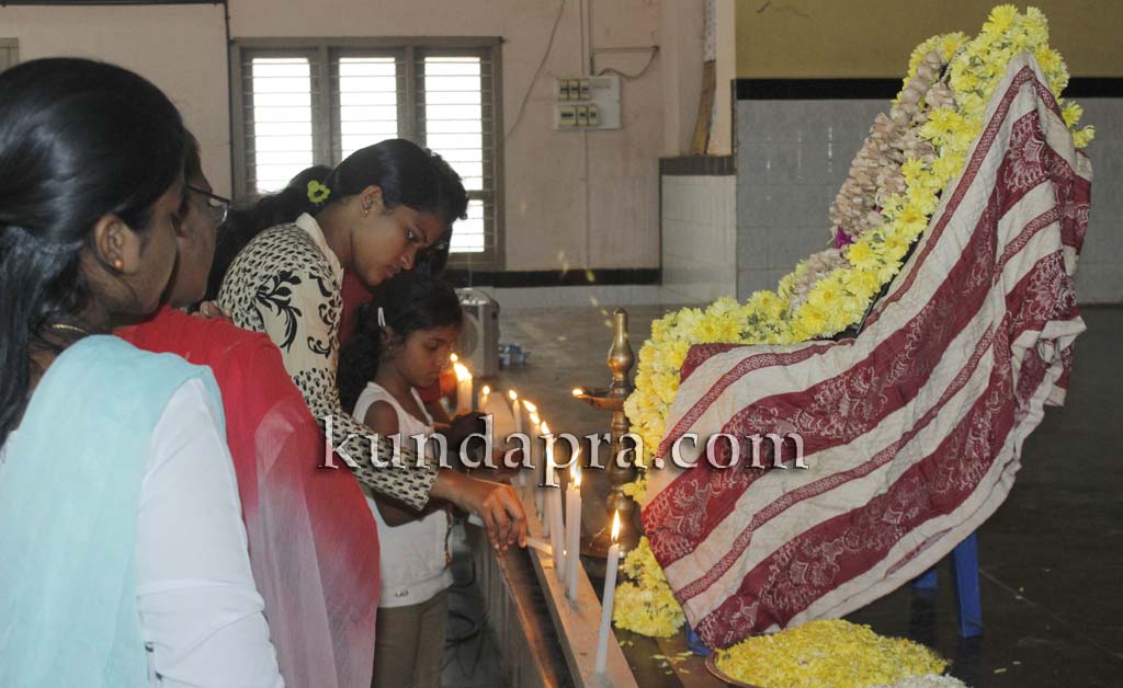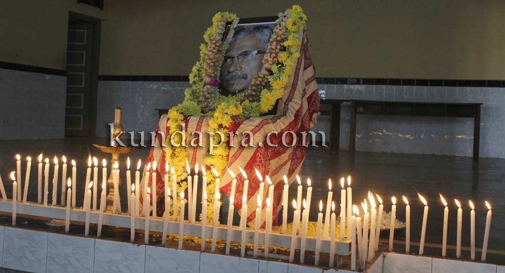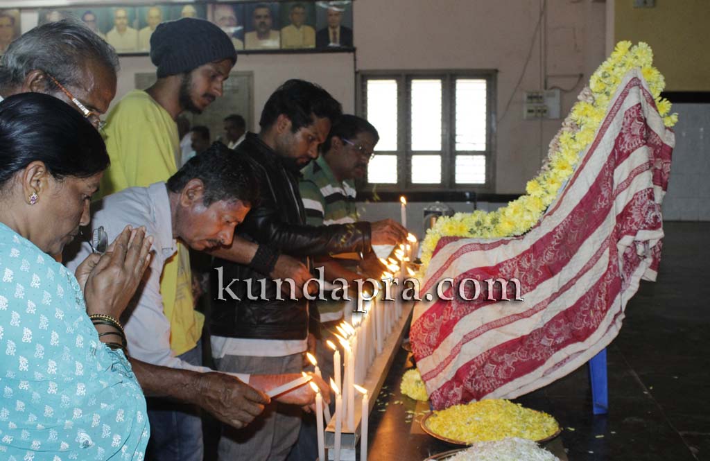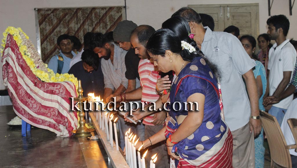 ಕುಂದಾಪುರ: ಹೆಮ್ಮಾಡಿಯಲ್ಲಿ ನಡೆದ ಅಪಘಾತದಲ್ಲಿ ಅಕಾಲಿಕ ಮರಣವನ್ನಪ್ಪಿದ ಚಿತ್ರಕಲಾ ಶಿಕ್ಷಕ ಭೋಜು ಹಾಂಡ ಅವರ ಸ್ಮರಣೆಯಲ್ಲಿ ಕೋಟೇಶ್ವರ ಪವವಿಪೂರ್ವ ಕಾಲೇಜಿನ ಸಭಾಂಗಣದಲ್ಲಿ ಶ್ರದ್ಧಾಂಜಲಿ ಸಭೆ ಆಯೋಜಿಸಲಾಗಿತ್ತು. ಭೋಜು ಹಾಂಡರ ವಿದ್ಯಾರ್ಥಿಗಳು, ಸ್ನೇಹಿತರು ಹಾಗೂ ಅಭಿಮಾನಿಗಳು ಮೇಣದ ಬತ್ತಿಗಳನ್ನು ಬೆಳಗಿ, ಪೋಟೋಗೆ ಪುಪ್ಪನಮನ ಸಲ್ಲಿಸಿದರು.