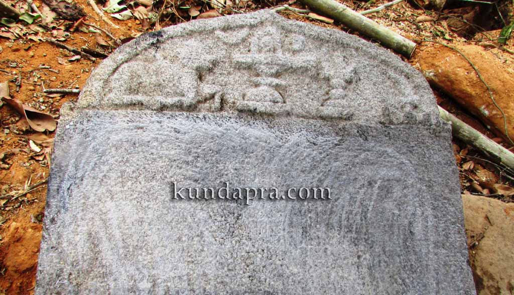 ಆಯತಾಕಾರದ ಸುಮಾರು ೧೧೦ ಸೆ.ಮೀ ಉದ್ದದ ಕಲ್ಲು ಚಪ್ಪಡಿ ಮೇಲ್ಭಾಗ ಕುದುರೆ ಲಾಳಾಕೃತಿಯಲ್ಲಿ ವಿನ್ಯಾಸಗೊಳಿಸಲಾಗಿದ್ದು, ಮೇಲಿನ ಪಟ್ಟಿಕಯಲ್ಲಿ ಸೂರ್ಯ-ಚಂದ್ರ, ಶಿವಲಿಂಗ, ದೀಪದ ಕಂಭ ಮತ್ತು ರಾಜ ಶಾಸನ ಎಂಬುದರ ಪ್ರತೀಕವಾಗಿ ಚಿತ್ರಿಸಿರುವ ಖಡ್ಗವಿದೆ.