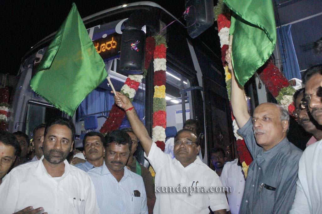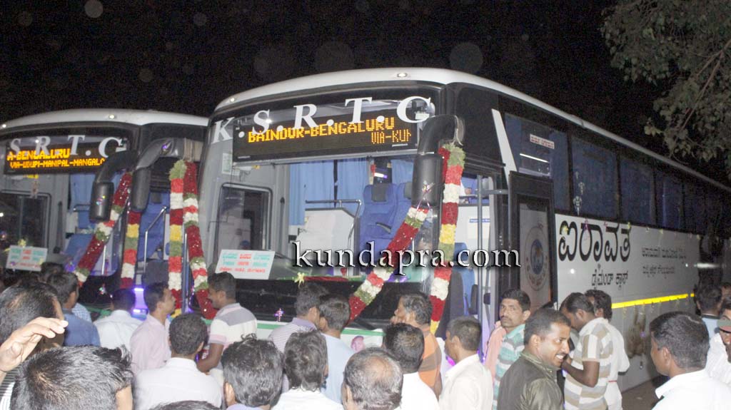 ಬೈಂದೂರು: ಬೈಂದೂರು ಹಾಗೂ ಗಂಗೊಳ್ಳಿಯಿಂದ ಕುಂದಾಪುರ, ಉಡುಪಿ ಮಂಗಳೂರು ಮಾರ್ಗವಾಗಿ ಬೆಂಗಳೂರು ತೆರಳುವ ಪ್ರಯಾಣಿಕರ ಅನುಕೂಲಕ್ಕಾಗಿ ರಾಜ್ಯ ರಸ್ತೆ ಸಾರಿಗೆ ನಿಗಮದಿಂದ ಹೊಸತಾಗಿ ಎರಡು ಸ್ಕ್ಯಾನಿಯಾ ಐರಾವತ್ ಬಸ್ಸುಗಳನ್ನು ಬಿಡಲಾಗಿದ್ದು, ಕೆಎಸ್ಆರ್ಟಿಸಿ ಅಧ್ಯಕ್ಷ ಕೆ. ಗೋಪಾಲ ಪೂಜಾರಿ ಅವರು ಇಂದು ಬೈಂದೂರು ಹಾಗೂ ಗಂಗೊಳ್ಳಿಯಲ್ಲಿ ಚಾಲನೆ ನೀಡಿದರು.