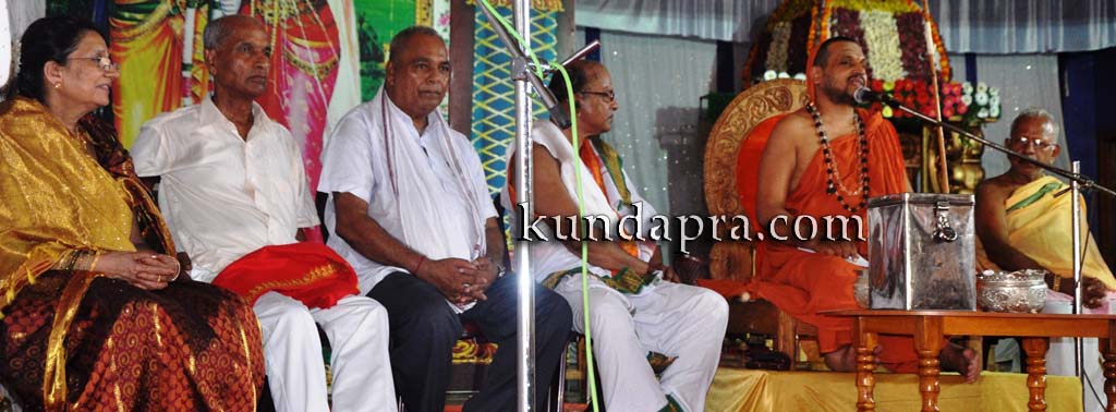 ಬೈಂದೂರು ಶ್ರೀ ಸೀತಾರಾಮಚಂದ್ರ ದೇವಸ್ಥಾನದಲ್ಲಿ ಬೈಂದೂರು ರಾಮಕ್ಷತ್ರಿಯ ಸಮಾಜದ ೧೨ನೇ ವರ್ಷದ ಶ್ರೀ ಸೀತಾರಾಮಚಂದ್ರ ಕಲ್ಯಾಣೋತ್ಸವ, ಬ್ರಹ್ಮಕಲಶೋತ್ಸವದ ಪ್ರಯುಕ್ತ ನಡೆದ ಧಾರ್ಮಿಕ ಸಭಾ ಕಾರ್ಯಕ್ರಮದಲ್ಲಿ ಆಶೀರ್ವಚನ ನೀಡಿದರು. ಧರ್ಮದ ಕೇಂದ್ರವಾದ ಕುಟುಂಬವು ನಿಜವಾದ ವ್ಯವಸ್ಥೆಯ ಹೆಬ್ಬಾಗಿಲು. ಗ್ರಹಸ್ಥ ಜೀವನದಲ್ಲಿ ಧರ್ಮದ ಮೂಲಕ ಸಾಗಿದಾಗ ಸುಖ, ಶಾಂತಿ ಹಾಗೂ ನೆಮ್ಮದಿ ಶಾಶ್ವತವಾಗಿರುತ್ತದೆ. ಶ್ರೀರಾಮನ ಆದರ್ಶ ಅನುಕರಣೀಯವಾಗಿದ್ದು, ರಾಮದೇವರ ಕಲ್ಯಾಣೋತ್ಸದಲ್ಲಿ ಹಲವಾರು ರೀತಿಯ ಪ್ರಯೋಜನಗಳಿದ್ದರೂ, ಸಮಾಜ ಸುಭೀಕ್ಷೆಯಾಗುತ್ತದೆ. ಇದರಿಂದ ನಾವು ನಮ್ಮ ಜೀವನದಲ್ಲಿ ಆದರ್ಶ, ತತ್ವ ಹಾಗೂ ಉತ್ತಮ ಚಿಂತನೆಗಳನ್ನು ಅಳವಡಿಸಿಕೊಳ್ಳಲು ಸಹಕಾರಿಯಾಗುತ್ತದೆ ಎಂದರು.