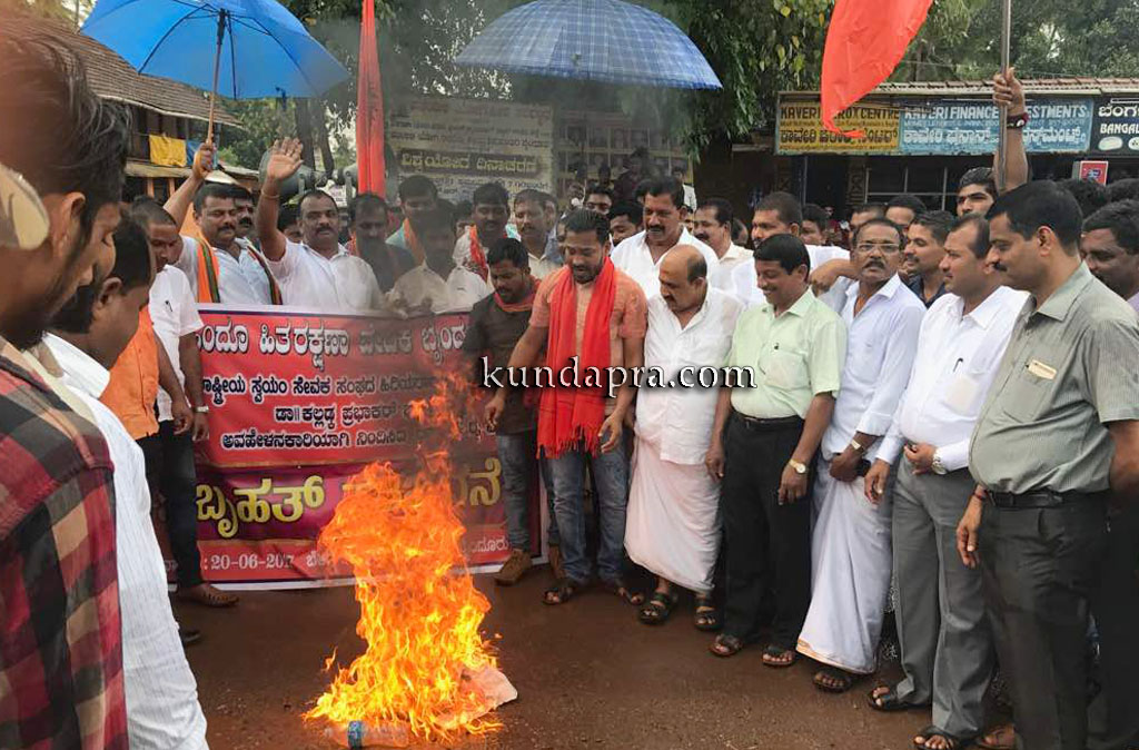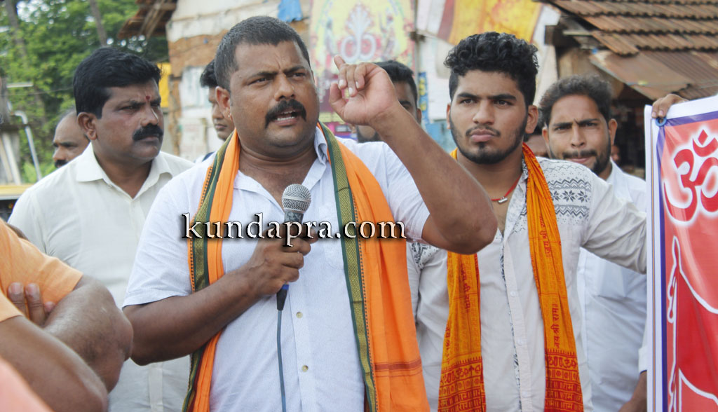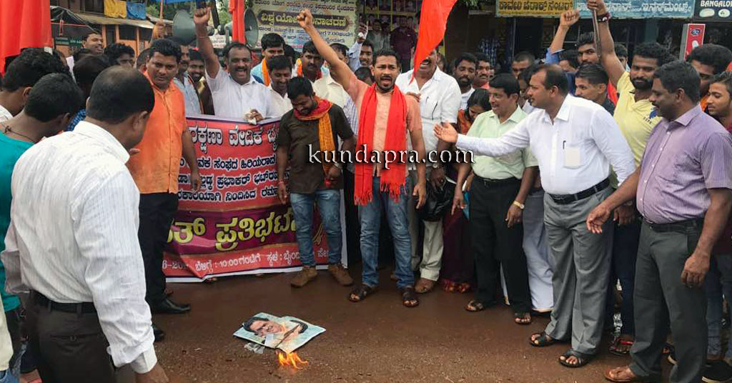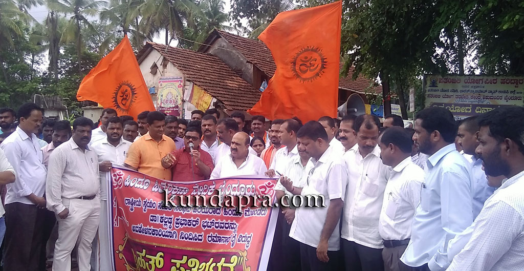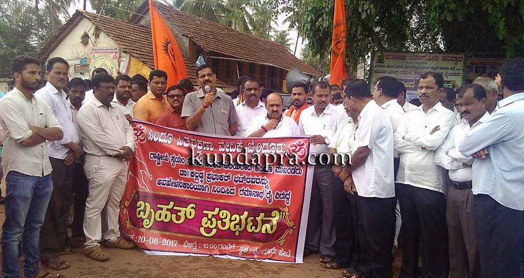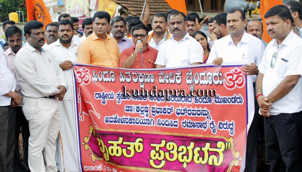 ಬೈಂದೂರು ಪೇಟೆಯಲ್ಲಿ ಹಿಂದೂ ಹಿತರಕ್ಷಣಾ ವೇದಿಕೆಯ ನೇತೃತ್ವದಲ್ಲಿ ಆಯೋಜಿಸಲಾಗಿದ್ದ ರಾಷ್ಟ್ರೀಯ ಸ್ವಯಂ ಸೇವಕ ಸಂಘದ ಮುಖಂಡರಾದ ಡಾ. ಕಲ್ಲಡ್ಕ ಪ್ರಭಾಕರ ಭಟ್ ಅವರನ್ನು ಅವಹೇಳನಕಾರಿಯಾಗಿ ನಿಂದಿಸಿದ ಸಚಿವ ರಮಾನಾಥ ರೈ ವಿರುದ್ಧ ನಡೆದ ಬೃಹತ್ ಪ್ರತಿಭಟನೆಯನ್ನು ಉದ್ದೇಶಿಸಿ ಮಾತನಾಡಿದರು.