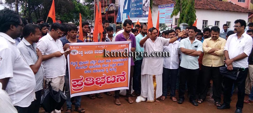 ಅವರು ಅರೆಸ್ಸೆಸ್ ಮುಖಂಡ ಕಲ್ಲಡ್ಕ ಪ್ರಭಾಕರ ಭಟ್ಟರ ಮೇಲೆ ಕೇಸು ದಾಖಲಿಸುವಂತೆ ಪೊಲೀಸ್ ಇಲಾಖೆಯ ಮೇಲೆ ಒತ್ತಡ ಹೇರಿದ ಸಚಿವ ರಮಾನಾಥ ರೈ ವಿರುದ್ದ ಸೋಮವಾರ ಕುಂದಾಪುರ ಶಾಸ್ತ್ರಿ ವೃತ್ತದಲ್ಲಿ ವಿಶ್ವ ಹಿಂದೂ ಪರಿಷತ್ ಮತ್ತು ಬಜರಂಗದಳ ಕುಂದಾಪುರ ಘಟಕದ ನೇತೃತ್ವದಲ್ಲಿ ನಡೆದ ಪ್ರತಿಭಟನೆಯಲ್ಲಿ ಮಾತನಾಡಿದರು. ಯಾವುದೇ ಕೊಲೆಗೆ ಪ್ರಯತ್ನವನ್ನು ಮಾಡದ ಕಲ್ಲಡ್ಕ ಪ್ರಭಾಕರ ಭಟ್ಟರ ಮೇಲೆ 307 ಪ್ರಕರಣ ದಾಖಲಿಸುವಂತೆ ಪೊಲೀಸ್ ಅಧಿಕಾರಿಗಳ ಮೇಲೆ ಒತ್ತಡ ತರಿಸಿರುವ ಸಚಿವ ರಮಾನಾಥ ರೈ ಅವರಿಗೆ ಕಲ್ಲಡ್ಕ ಅವರ ಬಂಧನವಲ್ಲ ಅವರ ಕನಿಷ್ಠ ಕೂದಲು ಮುಟ್ಟಲು ಸಾಧ್ಯವಿಲ್ಲ ಎಂದು ಆಕ್ರೋಶವ್ಯಕ್ತಪಡಿಸಿದರು.