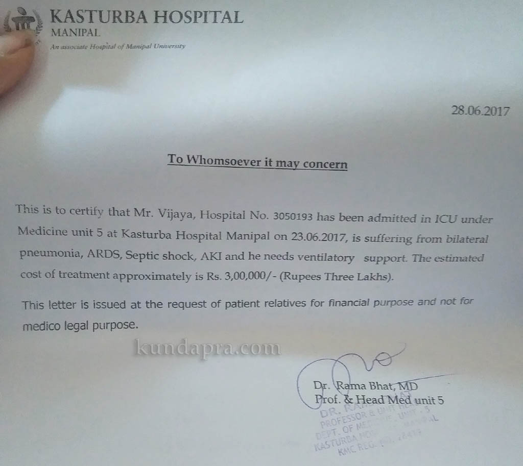 ಅಸ್ವಸ್ಥಗೊಂಡಿರುವ ವಿಜಯ್ ಅವರನ್ನು ಜೂ.23ರಂದು ಮಣಿಪಾಲ ಕಸ್ತೂರ್ಬಾ ಆಸ್ಪತ್ರೆಗೆ ದಾಖಲಿಸಲಾಗಿದ್ದು, ತೀವ್ರ ನಿಗಾ ಘಟಕದಲ್ಲಿ ಚಿಕಿತ್ಸೆ ಪಡೆಯುತ್ತಿದ್ದಾರೆ. ಅವರು ಗುಣಮುಖರಾಗಲು ಹೆಚ್ಚಿನ ಚಿಕಿತ್ಸೆಯ ನೀಡಬೇಕಾಗಿದ್ದು ವೈದ್ಯಕೀಯ ವೆಚ್ಚ ಸುಮಾರು 3ಲಕ್ಷ ರೂ. ತಗುಲಲಿದೆ ಎಂದು ವೈದ್ಯರು ತಿಳಿಸಿದ್ದಾರೆ. ಅಷ್ಟು ದೊಡ್ಡ ಮೊತ್ತವನ್ನು ಕುಟುಂಬದವರಿಗೆ ಹೊಂದಿಸಿಕೊಳ್ಳಲು ಕಷ್ಟವಾಗುತ್ತಿದ್ದು ಸಹೃದಯಿಗಳ ಉದಾರ ನೆರವನ್ನು ಅವರು ಕೋರಿದ್ದಾರೆ.