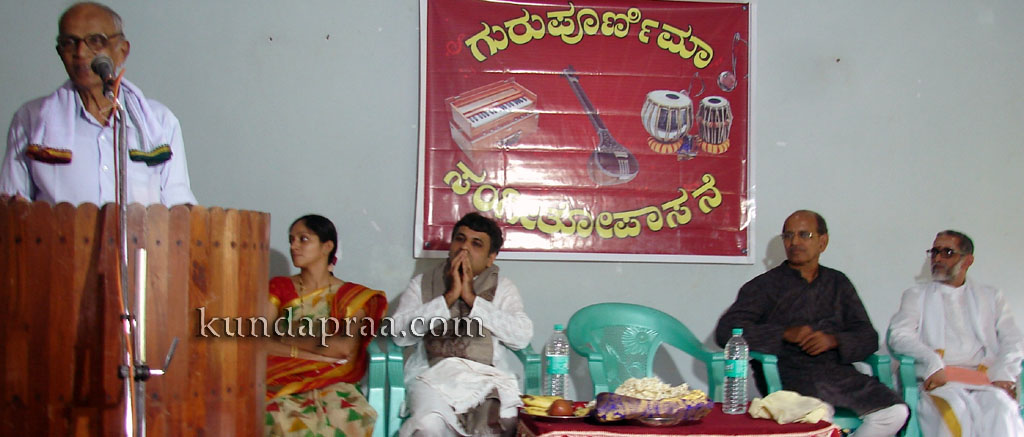ಸಂಗೀತದ ಬಗೆಗೆ ಮಾತನಾಡಿದ ಅವರು ಅದು ಕಲೆಗಳಲ್ಲೇ ಅತ್ಯಂತ ಪ್ರಾಚೀನವಾದುದು. ಅದು ದೇವಾನುದೇವತೆಗಳ ಕೊಡುಗೆ. ಮನುಷ್ಯ ಜೀವನದಲ್ಲೂ ಅದು ಹಾಸುಕೊಕ್ಕಾಗಿದೆ. ಆ ಕಲೆ ಗಳಿಸಿದವರ ಜತೆಯಲ್ಲಿ ಸದಾ ಇರುತ್ತದೆ ಎಂದು ಹೇಳಿದರು. ಗುರುಪೂರ್ಣಿಮೆಯ ನೆವದಲ್ಲಿ ಗುರುಪೂಜೆ ಸಲ್ಲಿಸುವ ಪರಿಪಾಠವನ್ನು ಶ್ಲಾಘಿಸಿದ ಅವರು ಗುರುಭಕ್ತಿಯಿಂದ ಮಾತ್ರ ಕಲಿತ ವಿದ್ಯೆ ಸಿದ್ಧಿಸುತ್ತದೆ ಎಂದರು.