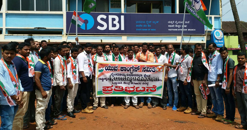 ಬೈಂದೂರು: ಕೇಂದ್ರ ಸರ್ಕಾರ ರಾಷ್ಟ್ರೀಯ ಬ್ಯಾಂಕುಗಳಲ್ಲಿನ ಕೃಷಿಕರ ಸಾಲಮನ್ನಾ ಮಾಡಬೇಕೆಂದು ಆಗ್ರಹಿಸಿ ಬೈಂದೂರಿನಲ್ಲಿ ಯುವ ಕಾಂಗ್ರೆಸ್ ಕಾರ್ಯಕರ್ತರು ಬೃಹತ್ ಪ್ರತಿಭಟನೆ ನಡೆಸಿ ಇಲ್ಲಿನ ವಿಶೇಷ ತಹಶೀಲ್ದಾರ ಮೂಲಕ ಕೇಂದ್ರ ಸರ್ಕಾರಕ್ಕೆ ಮನವಿ ಸಲ್ಲಿಸಿದರು.