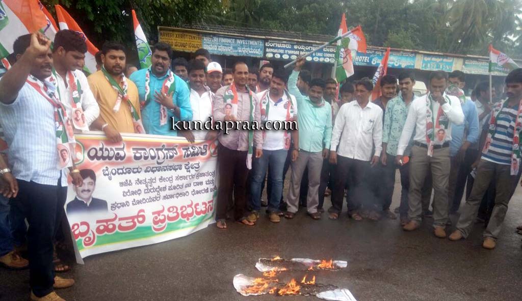 ಬೈಂದೂರು ಯುವ ಕಾಂಗ್ರೆಸ್ ವತಿಯಿಂದ ಬೈಂದೂರು ಬೈಪಾಸ್ ಬಳಿ ಪ್ರತಿಭಟನೆ ಜರುಗಿತು. ಈ ಸಂದರ್ಭ ಬೈಂದೂರು ಯುವ ಕಾಂಗ್ರೆಸ್ ಅಧ್ಯಕ್ಷ ಶೇಖರ ಪೂಜಾರಿ, ವಸಂತ ಹೆಗ್ಡೆ ಅರೆಶಿರೂರು, ಸುಬ್ರಹ್ಮಣ್ಯ ಪೂಜಾರಿ, ಸನತ್ ಬಳೆಗಾರ್, ಪವನ ಗಾಣಿಗ ಕೊಲ್ಲೂರು, ರೋಶನ್ ಪೂಜಾರಿ, ಪ್ರಜ್ವಲ್ ದೇವಾಡಿಗ ಮೊದಲಾದವರು ಪ್ರತಿಭಟನೆಯಲ್ಲಿ ಭಾಗವಹಿಸಿದ್ದರು.
