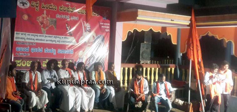 ಕೊಲ್ಲೂರು: ವಿಶ್ವ ಹಿಂದೂ ಪರಿಷತ್ ಬಜರಂಗದಳ ನೇರಳಕಟ್ಟೆ ಘಟಕದ ನೇತೃತ್ವದಲ್ಲಿ ಅಖಂಡ ಭಾರತ ಸಂಕಲ್ಪ ದಿನದ ಪ್ರಯುಕ್ತ ಪಂಜಿನ ಮೆರವಣಿಗೆ, ಸಭೆಯನ್ನು ನೇರಳಕಟ್ಟೆ ಶ್ರೀ ಲಕ್ಷ್ಮೀ ವೆಂಕಟರಮಣ ದೇವಸ್ಥಾನದಲ್ಲಿ ಆಯೋಜಿಸಲಾಗಿತ್ತು.