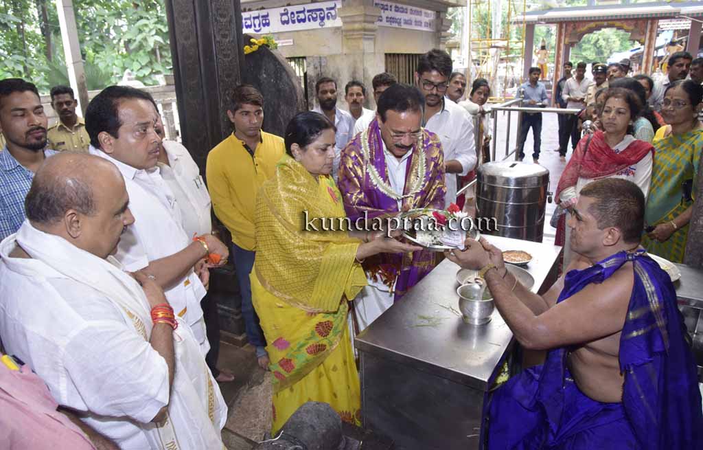 ಕುಂದಾಪುರ: ಇತಿಹಾಸ ಪ್ರಸಿದ್ದ ಹಟ್ಟಿಯಂಗಡಿ ಶ್ರೀ ಸಿದ್ಧಿವಿನಾಯಕ ದೇವಸ್ಥಾನಕ್ಕೆ ಕೇಂದ್ರ ಕಾನೂನು ಸಚಿವ ಡಿ.ವಿ.ಸದಾನಂದ ಗೌಡ ಕುಟುಂಬ ಸಮೇತ ಭೇಟಿ ನೀಡಿ ವಿಶೇಷ ಪೂಜೆ ಸಲ್ಲಿಸಿದರು. ಕ್ಷೇತ್ರಕ್ಕೆ ಆಗಮಿಸಿದ ಸಚಿವರನ್ನು ದೇವಳದ ಆಡಳಿತ ಧರ್ಮದರ್ಶಿ ಹೆಚ್.ರಾಮಚಂದ್ರ ಭಟ್ ಸ್ವಾಗತಿಸಿ ಗೌರವಿಸಿದರು. ಈ ಸಂದರ್ಭದಲ್ಲಿ ದೇವಳದ ಪ್ರದಾನ ಅರ್ಚಕ ಬಾಲಚಂದ್ರ ಭಟ್, ಬಿಜೆಪಿ ಮುಖಂಡ ಸುಕುಮಾರ್ ಶೆಟ್ಟಿ, ಉದ್ಯಮಿ ಅಶೋಕ ರೈ ಮಂಗಳೂರು, ಬಿಜೆಪಿ ಬೈಂದೂರು ಕ್ಷೇತ್ರಾಧ್ಯಕ್ಷ ಸದಾನಂದ ಉಪ್ಪಿನಕುದ್ರು, ಹಟ್ಟಿಯಂಗಡಿ ಗ್ರಾ. ಪಂ. ಅಧ್ಯಕ್ಷ ರಾಜೀವ ಶೆಟ್ಟಿ, ಕರುಣಾ ಪೂಜಾರಿ ಇನ್ನಿತರರು ಉಪಸ್ಥಿತರಿದ್ದರು.