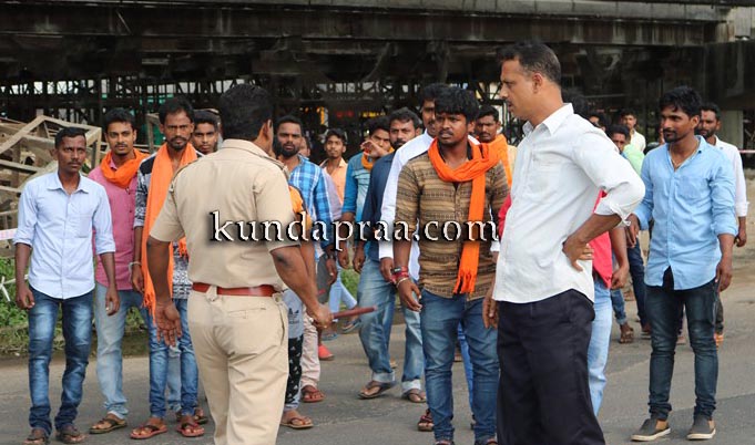 ಕುಂದಾಪುರ: ಇಲ್ಲಿನ ಶಾಸ್ತ್ರಿ ವೃತ್ತದಲ್ಲಿ ಕುಂದಾಪುರ ಪೊಲೀಸ್ ಠಾಣಾಧಿಕಾರಿ ನಾಸೀರ್ ಹುಸೇನ್ ಅವರ ವಿರುದ್ಧ ಹಿಂದೂ ಜಾಗರಣಾ ವೇದಿಕೆ ಸೇರಿದಂತೆ ಪರಿವಾರ ಸಂಘಟನೆಗಳು ಆಯೋಜಿಸಿದ್ದ ಪ್ರತಿಭಟನೆಗೆ ಪೊಲೀಸರು ತಡೆಯೊಡ್ಡಿದ್ದು, ಪೂರ್ವನುಮತಿಯಿಲ್ಲದೇ ಪ್ರತಿಭಟನೆಗೆ ಮಾಡುತ್ತಿದ್ದಾರೆಂಬ ಕಾರಣವೊಡ್ಡಿ ಪ್ರತಿಭಟನೆಗೆ ಮುಂದಾದ ಮುಖಂಡರನ್ನು ವಶಕ್ಕೆ ಪಡೆದು ಠಾಣೆಗೆ ಕರೆದೊಯ್ದ ಘಟನೆ ನಡೆಯಿತು.