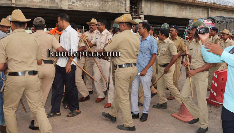 ಅನುಮತಿ ಇಲ್ಲದೆ ಪ್ರತಿಭಟನೆಗೆ ಮುಂದಾಗುವ ಬಗ್ಗೆ ಪೊಲೀಸ್ ಬಿಗು ಬಂದೋಸಬಸ್ತ್ ಏರ್ಪಡಿಸಿದ್ದರು. ಎಸ್ಪಿ ಡಾ. ಸಂಜೀವ ಪಾಟೀಲ್ ಕೂಡಾ ಕುಂದಾಪುರಕ್ಕೆ ಆಗಮಿಸಿದ್ದರು. ಸಿಪಿಐ ಮಂಜಪ್ಪ, ಠಾಣಾಧಿಕಾರಿ ನಾಸೀರ್ ಹುಸೇನ್ ನೇತೃತ್ವದಲ್ಲಿ ಕೆಎಸ್ಆರ್ಪಿ, ಡಿಎಆರ್ ತುಕಡಿ ಹಾಗೂ ನೂರಾರು ಸಿಬ್ಬಂದಿ ನೇಮಕ ಮಾಡಲಾಗಿತ್ತು. ಶಾಸ್ತ್ರಿ ವೃತ್ತದ ಆಸುಪಾಸು ನಿಂತಿದ್ದವರನ್ನೂ, ಹಾಗೂ ಕಾಲೇಜ್ ವಿದ್ಯಾರ್ಥಿಗಳನ್ನು ಕೂಡಾ ಬಿಡದೆ ಪೊಲೀಸರು ಚದುರಿಸಿದರು. ಈ ಸಂದರ್ಭ ಬಿಜೆಪಿ ಮುಖಂಡರು ಮತ್ತು ಪೊಲೀಸರ ನಡುವೆ ಮಾತಿನ ಚಕಮಕಿ ನಡೆಯಿತು. ವಶಕ್ಕೆ ಪಡೆದವರನ್ನು ಬಿಡಗಡೆ ಮಾಡುವ ಆಶ್ವಾಸನೆ ನೀಡಿದ ಹಿನ್ನೆಲೆಯಲ್ಲಿ ಪರಿಸ್ಥಿತಿ ಶಾಂತವಾಯಿತು. ಕುಂದಾಪ್ರ ಡಾಟ್ ಕಾಂ ಸುದ್ದಿ.