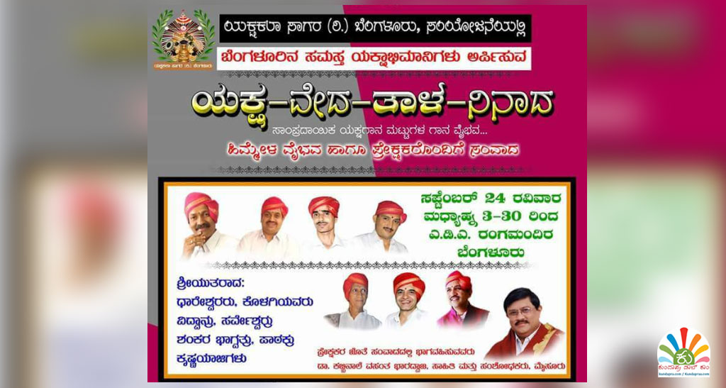 ಬೆಂಗಳೂರಿನ ಯಕ್ಷ ಕಲಾ ಸಾಗರ ಸೆಪ್ಟೆಂಬರ್ 24 ಭಾನುವಾರ ಮಧ್ಯಾಹ್ನ 3:30ಕ್ಕೆ ರವೀಂದ್ರ ಕಲಾಕ್ಷೇತ್ರ ಮುಂಬಾಗದ ಎಡಿಎ ರಂಗಮಂದಿರದಲ್ಲಿ ಯಕ್ಷ ವೇದ ತಾಳ ನಿನಾದ ಕಾರ್ಯಕ್ರಮ ಆಯೋಜಿಸಿದೆ. ಕಾರ್ಯಕ್ರಮದಲ್ಲಿ ಯಕ್ಷಗಾನದ ರಾಗ, ತಾಳ, ನರ್ತನ, ಸಾಹಿತ್ಯ, ಮಟ್ಟು, ತಿಟ್ಟು, ಪ್ರಬೇಧ ಹೀಗೆ ಎಲ್ಲಾ ಆಯಾಮದ ಸಂವಾದಿಂದ ನಮ್ಮಲ್ಲಿರುವ ಜಿಜ್ಞಾಸೆಗಳಿಗೆ ಉತ್ತರ ದೊರಕಲಿದೆ.