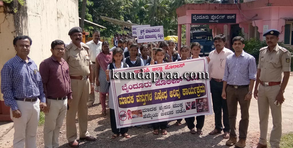 ಬೈಂದೂರು: ಸರ್ಕಾರಿ ಪ್ರಥಮ ದರ್ಜೆ ಕಾಲೇಜು ರಾಷ್ಟ್ರೀಯ ಸೇವಾ ಯೋಜನೆ, ರೋವರ್ ರೇಂಜರ್ ಘಟಕ ಹಾಗೂ ಬೈಂದೂರು ಪೋಲೀಸ್ ಠಾಣೆ ಇವರ ಜಂಟಿ ಆಶ್ರಯದಲ್ಲಿ ರಾಷ್ಟ್ರೀಯ ಮಾದಕ ವಸ್ತುಗಳ ನಿಷೇಧ ಅರಿವು ಪ್ರಯುಕ್ತ ಬೈಂದೂರು ಪೇಟೆಯಲ್ಲಿ ಜಾಥಾ ನಡೆಯಿತು. ಬೈಂದೂರು ವೃತ್ತ ನಿರೀಕ್ಷಕ ರಾಘವ ಎಸ್. ಪಡೀಲ್ ಜಾಥಕ್ಕೆ ಚಾಲನೆ ನೀಡಿದರು. ವಿದ್ಯಾರ್ಥಿಗಳು ಹಾಗೂ ಯುವ ಜನತೆ ಮಾದಕ ವಸ್ತುಗಳಿಗೆ ಬಲಿಯಾಗದೇ ತಮ್ಮ ಸುತ್ತ ಮುತ್ತಲಿನ ಪರಿಸರದಲ್ಲಿ ಮಾದಕ ವಸ್ತುಗಳ ನಿಷೇಧದ ಬಗ್ಗೆ ಅರಿವು ಮೂಡಿಸುವ ಬಗ್ಗೆ ತಿಳಿಸಿದರು. ರಾಷ್ಟ್ರೀಯ ಸೇವಾ ಯೋಜನಾಧಿಕಾರಿ ರವಿಚಂದ್ರ, ಉಪನ್ಯಾಸಕರಾದ ವಿನೋದ್, ನಾಗರಾಜ ಶೆಟ್ಟಿ, ನವೀನ್ ಉಪಸ್ಥಿತರಿದ್ದರು. ಬೈಂದೂರು ಠಾಣಾಧಿಕಾರಿ ತಿಮ್ಮೇಶ್ ಬಿ. ಎನ್. ಹಾಗೂ ಸಿಬ್ಬಂದಿ ವರ್ಗದವರು ಜಾಥಕ್ಕೆ ಸಹಕರಿಸಿದರು.