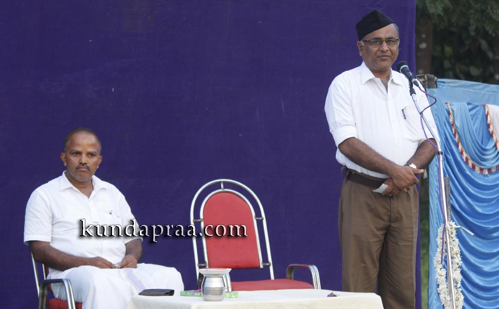 ಅವರು ಇಲ್ಲಿನ ಗಾಂಧಿ ಮೈದಾನದಲ್ಲಿ ರಾಷ್ಟ್ರೀಯ ಸ್ವಯಂ ಸೇವಾ ಸಂಘದ ಪಥಸಂಚಲದ ಬಳಿಕ ಜರುಗಿದ ಸಭೆಯಲ್ಲಿ ಮಾತನಾಡಿದರು. ಸಂಘದ ಪ್ರತಿಯೊಬ್ಬರೂ ತಾನೊಬ್ಬ ವ್ಯಕ್ತಿಯಲ್ಲ ಸಮಷ್ಠಿಯ ಭಾಗ ಎಂದು ಅರಿಯುವುದು ಪಥ ಸಂಚಲನದ ಉದ್ದೇಶವಾಗಿದ್ದು, ಈ ಮೂಲಕ ಜನರಲ್ಲಿ ಸ್ಥೈರ್ಯ ತುಂಬುವ ಕೆಲಸವನ್ನು ಮಾಡಲಾಗುತ್ತಿದೆ ಎಂದರು.