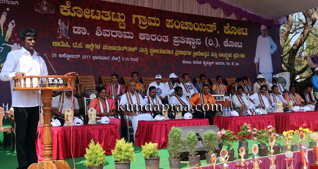 ಅವರು ಕೋಟ ವಿವೇಕ ಪದವಿ ಪೂರ್ವ ಕಾಲೇಜಿನ ಆವರಣದಲ್ಲಿ ಕೋಟತಟ್ಟು ಗ್ರಾಮ ಪಂಚಾಯತ್, ಡಾ.ಶಿವರಾಮ ಕಾರಂತ ಪ್ರತಿಷ್ಠಾನ (ರಿ.) ಕೋಟ, ಡಾ.ಶಿವರಾಮ ಕಾರಂತ ಜನ್ಮ ದಿನೋತ್ಸವದ ಅಂಗವಾಗಿ ಉಡುಪಿ, ದಕ್ಷಿಣ ಕನ್ನಡ ಜಿಲ್ಲೆಗಳ ಪಂಚಾಯತ್ ರಾಜ್ ಮತ್ತು ನಗರ ಸ್ಥಳೀಯಾಡಳಿತ ಪ್ರತಿನಿಧಿಗಳ ಕ್ರೀಡೋತ್ಸವ ಸಾಂಸ್ಕೃತಿಕ ಸ್ಪರ್ಧೆ ಹೊಳಪು ೨೦೧೭ ಕಾರ್ಯಕ್ರಮದಲ್ಲಿ ಪ್ರಸ್ತಾವಿಕವಾಗಿ ಮಾತನಾಡಿ, ಗ್ರಾಮ ಪಂಚಾಯತ್ ಕುರಿತು ಅತೀ ಹೆಚ್ಚು ಒತ್ತು ನೀಡಿದ ಹಿಂದಿನ ಮಂತ್ರಿ ಅಬ್ದಲ್ ನಜೀರ್ ಸಾಬ್ ಹೆಸರಿನ ವೇದಿಕೆಯಲ್ಲಿ, ಡಾ.ಕೋಟ ಶಿವರಾಮ ಕಾರಂತರ ಜನ್ಮದಿನೋತ್ಸವ ಅಂಗವಾಗಿ ನಡೆಯುತ್ತಿರುವುದು ಸಂತಸದ ವಿಷಯ. ಕ್ರೀಡೋತ್ಸವದ ಅಂಗವಾಗಿ ಪಥ ಸಂಚಲನದಲ್ಲಿ ಭಾಗವಹಿಸಿದ ಪ್ರತಿ ಗ್ರಾಮ ಪಂಚಾಯತ್ ಸದಸ್ಯರು ಕೂಡ ರಾಷ್ಟ್ರ ಮಟ್ಟದ ಕ್ರೀಡಾ ಪಟುವಿಗೆ ಕಡಿಮೆ ಇಲ್ಲ ಎನ್ನುವಂತೆ ಭಾಗವಹಿಸಿರುವುದು ಅವರಲ್ಲಿ ಶ್ರದ್ಧೆ ತೋರಿಸುತ್ತದೆ ಎಂದರು.