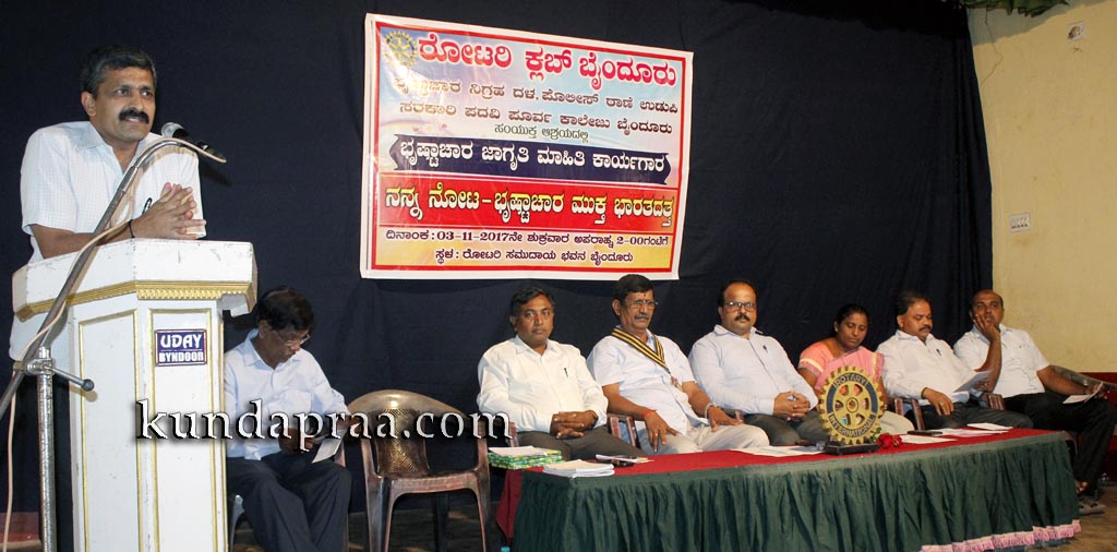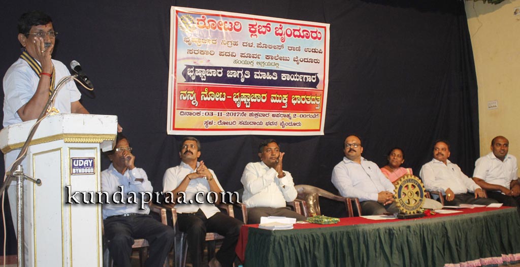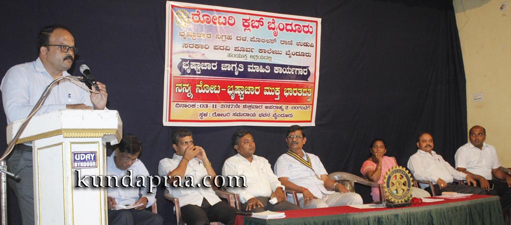 ಅವರು ರೋಟರಿ ಕ್ಲಬ್ ಬೈಂದೂರು, ಉಡುಪಿ ಭ್ರಷ್ಟಾಚಾರ ನಿಗ್ರಹ ದಳ ಪೊಲೀಸ್ ಠಾಣೆ ಉಡುಪಿ, ಸರಕಾರಿ ಪದವಿಪೂರ್ವ ಕಾಲೇಜು ಬೈಂದೂರು ಸಂಯುಕ್ತ ಆಶ್ರಯದಲ್ಲಿ ಇಲ್ಲಿನ ರೋಟರಿ ಸಮುದಾಯ ಭವನದಲ್ಲಿ ಜರುಗಿದ ’ನನ್ನ ನೋಟ ಭ್ರಷ್ಟಾಚಾರ ಮುಕ್ತ ಭಾರತದತ್ತ’ ಭೃಷ್ಟಾಚಾರ ಜಾಗೃತಿ ಮಾಹಿತಿ ಕಾರ್ಯಾಗಾರದಲ್ಲಿ ಮಾತನಾಡಿದರು.