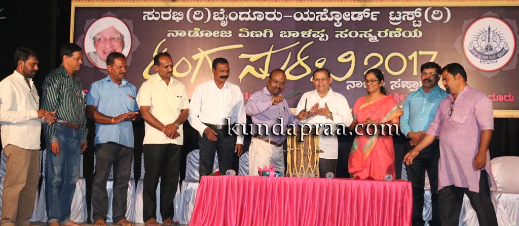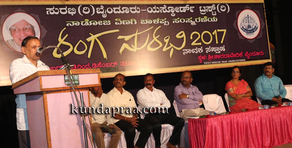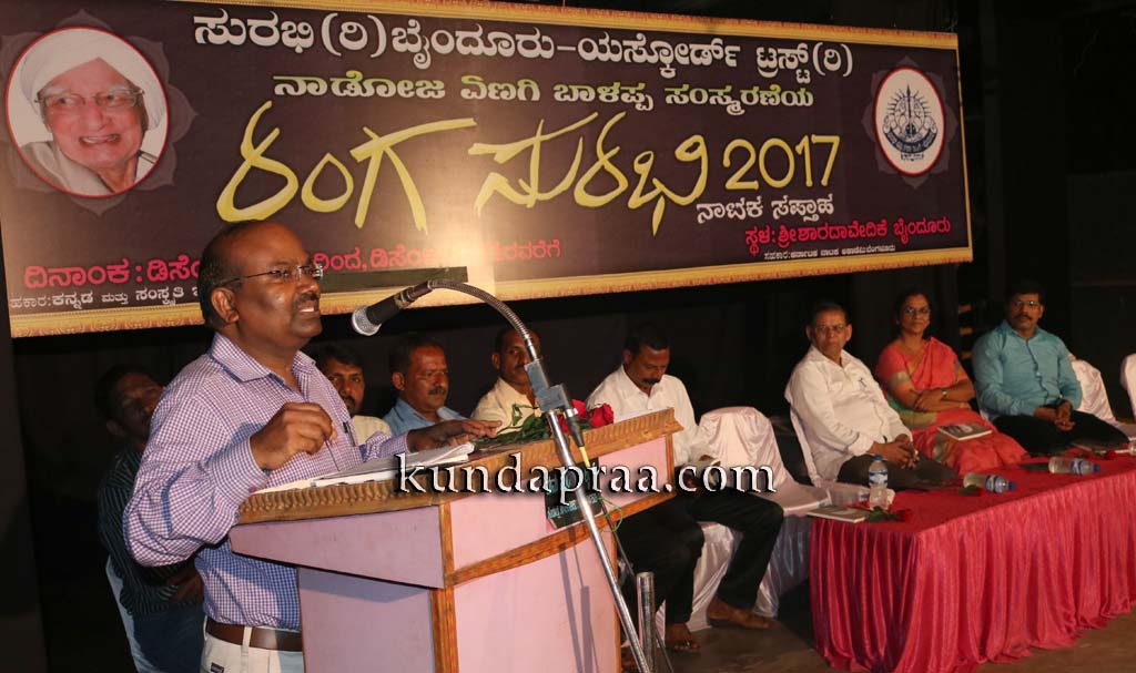 ಅವರು ಇಲ್ಲಿನ ಶಾರದಾ ವೇದಿಕೆಯಲ್ಲಿ ಸುರಭಿ ರಿ. ಬೈಂದೂರು ಹಾಗೂ ಯಸ್ಕೋರ್ಡ್ ಟ್ರಸ್ಟ್ ರಿ. ಆಶ್ರಯದಲ್ಲಿ ನಡೆಯುತ್ತಿರುವ ನಾಡೋಜ ಏಣಗಿ ಬಾಳಪ್ಪ ಸಂಸ್ಮರಣೆಯ ರಂಗಸುರಭಿ 2017 ನಾಟಕ ಸಪ್ತಾಹವನ್ನು ಉದ್ಘಾಟಿಸಿ, ಏಣಗಿ ಬಾಳಪ್ಪ ಅವರ ಭಾವಚಿತ್ರಕ್ಕೆ ಪುಪ್ಪ ಸಮರ್ಪಿಸಿ ಬಳಿಕ ಮಾತನಾಡಿದರು. ನಾಟಕ ಉತ್ಸವದ ನೆಪದಲ್ಲಿ ರಂಗಾಸಕ್ತರು ಸೇರುವಂತೆ ಮಾಡುವುದೇ ದೊಡ್ಡ ಕೆಲಸ. ಒಳ್ಳೆಯ ನಾಟಕಗಳನ್ನು ನೋಡುವುದೆಂದರೆ ಉತ್ತಮ ಕೃತಿಗಳನ್ನು ಓದಿದಂತೆ. ನೈಜವಾಗಿರುವ ರಂಗಭೂಮಿ ಪ್ರೇಕ್ಷಕರಿಗೆ ಸದಾ ಆಪ್ತವಾಗುತ್ತದೆ ಎಂದವರು ಹೇಳಿದರು.