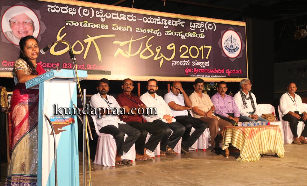ಅವರು ಇಲ್ಲಿನ ಶಾರದಾ ವೇದಿಕೆಯಲ್ಲಿ ಸುರಭಿ ರಿ. ಬೈಂದೂರು ಹಾಗೂ ಯಸ್ಕೋರ್ಡ್ ಟ್ರಸ್ಟ್ ರಿ. ಆಶ್ರಯದಲ್ಲಿ ನಡೆಯುತ್ತಿರುವ ನಾಡೋಜ ಏಣಗಿ ಬಾಳಪ್ಪ ಸಂಸ್ಮರಣೆಯ ರಂಗಸುರಭಿ ೨೦೧೭ ನಾಟಕ ಸಪ್ತಾಹದ ಎರಡನೇ ದಿನ ಏಣಗಿ ಬಾಳಪ್ಪ ಅವರ ಭಾವಚಿತ್ರಕ್ಕೆ ಪುಪ್ಪ ನಮನ ಸಲ್ಲಿಸಿ ಬಳಿಕ ಮಾತನಾಡಿದರು. ಸಿನೆಮಾ, ಧಾರಾವಾಹಿ, ಸಾಮಾಜಿಕ ಜಾಲತಾಣಗಳು ಸೇರಿದಂತೆ ವಿವಿಧ ಬಗೆಯ ಮಾಧ್ಯಮಗಳಲ್ಲಿ ಭಿತ್ತರವಾಗುತ್ತಿರುವ ಅಂಶಗಳು ಸಮಾಜವನ್ನು ಕಲುಷಿತಗೊಳಿಸಿರುವ ಹೊತ್ತಿನಲ್ಲಿ ಕ್ಷೇತ್ರದ ವಿಚಾರಗಳನ್ನು ಒಳಗೊಂಡಿರುವ ರಂಗಭೂಮಿ ಪರಿಹಾರ ಆಗಬಲ್ಲದು. ದಾರಿ ತಪ್ಪುತ್ತಿರುವ ಯುವಕ ಸಮುದಾಯ ರಂಗಭೂಮಿಯಲ್ಲಿ ಹೆಚ್ಚೆಚ್ಚು ತೊಡಗಿಸಿಕೊಳ್ಳವ ಅಗತ್ಯವೂ ಇದೆ ಎಂದರು.