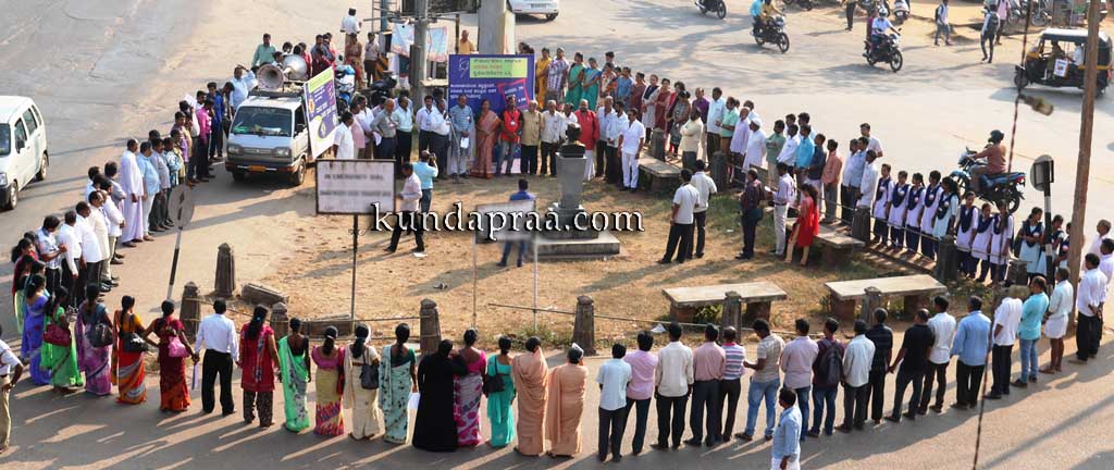 ಕುಂದಾಪುರ ಶಾಸ್ತ್ರಿ ವೃತ್ತದಲ್ಲಿ ವಿವಿಧ ಸಂಘಟನೆ ಆಶ್ರಯದಲ್ಲಿ ಮಂಗಳವಾರ ನಡೆದ ಸೌಹಾರ್ದತೆಗಾಗಿ ಮಾನವ ಸರಪಳಿ ಕಾರ್ಯಕ್ರಮದಲ್ಲಿ ಪ್ರತಿಜ್ಞಾ ವಿಧಿ ಸ್ವೀಕರಿಸಿ ಮಾತನಾಡಿ, ಮಹಾತ್ಮ ಗಾಂಧಿ ಕೂಡಾ ಎಲ್ಲರಲ್ಲೂ ಮಾನವೀಯ ಗುಣ ಕಂಡಿದ್ದರಿಂದ ಮಹಾತ್ಮರಾದರು. ಹಂತಕರ ಗುಂಡಿಗೆ ಬಲಿಯಾದ ದಿನ ಮಾನವ ಸರಪಳಿ ಮೂಲಕ ಗಾಂಧಿ ಆಶಯ ಈಡೇರಿಸಬೇಕಾಗಿದೆ ಎಂದು ಹೇಳಿದರು.