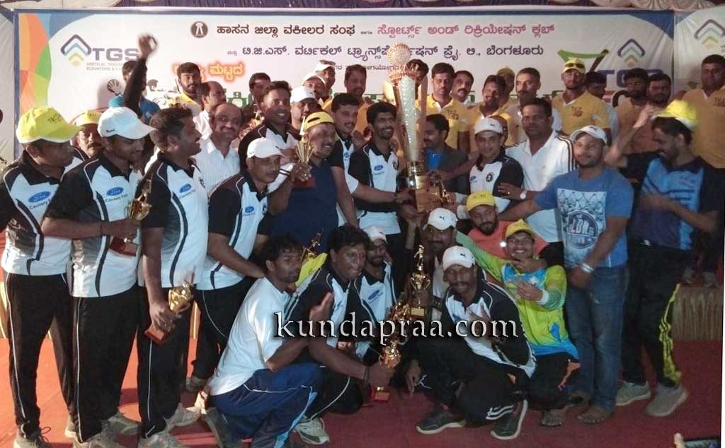 ಕುಂದಾಪುರ: ಹಾಸನದಲ್ಲಿ ನಡೆದ ರಾಜ್ಯ ಮಟ್ಟದ ಎಲ್ಲಾ ಬಾರ್ ಅಸೋಸಿಯೇಶನ್ಗಳಲ್ಲದೆ ಇತರ ತಂಡಗಳು ಸೇರಿದಂತೆ ೪೨ ಬಲಿಷ್ಠ ಕ್ರಿಕೆಟ್ ತಂಡಗಳು ಭಾಗವಹಿಸಿದ ಪ್ರತಿಷ್ಠಿತ ಕ್ರೀಡಾಕೂಟದಲ್ಲಿ ಕುಂದಾಪುರ ಮತ್ತು ಉಡುಪಿ ವಕೀಲರ ಜಂಟೀ ತಂಡವು ಪ್ರಥಮ ಪ್ರಶಸ್ತಿಯನ್ನು ತನ್ನದಾಗಿಸಿಕೊಂಡಿದೆ.