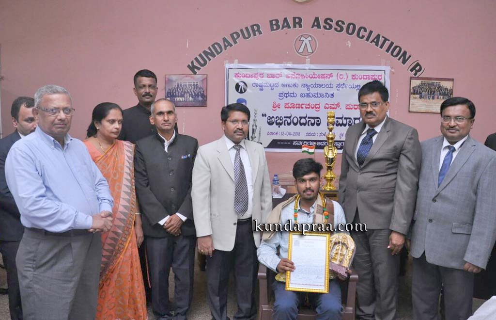 ಕುಂದಾಪುರ: ಕುಂದಾಪುರ ಬಾರ್ ಅಸೋಸಿಯೇಶನ್ ರಿ. ಕುಂದಾಪುರ ಇದರ ವತಿಯಿಂದ ರಾಷ್ಟ್ರ ಮಟ್ಟದ ಅಣಕು ನ್ಯಾಯಾಲಯ ಸ್ಪರ್ಧೆಯಲ್ಲಿ ಪ್ರಥಮ ಸ್ಥಾನ ಪಡೆದ ಪೂರ್ಣಚಂದ್ರ ಎಲ್ ಪುರಾಣಿಕರನ್ನು ಸನ್ಮಾನಿಸಲಾಯಿತು.