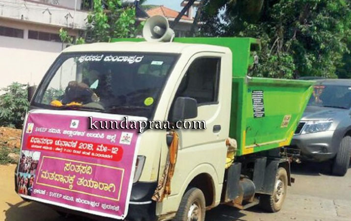 ಕುಂದಾಪುರ: ಇಲ್ಲಿನ ಪುರಸಭೆಯ ಕಸದ ಲಾರಿಗಳಲ್ಲೂ ಮತದಾನ ಜಾಗೃತಿಯ ಫ್ಲೆಕ್ಸ್ ನೇತಾಡುತ್ತಿದೆ. ಚುನಾವಣೆ ಎಂಬ ಹಬ್ಬ ಬಂತು ಎಂದು ಯಕ್ಷಗಾನದ ಹಾಡು ಕೇಳುತ್ತಿದೆ. ಮತದಾನ ಜಾಗೃತಿಗೆ ಎಲ್ಲೆಡೆ ವಿವಿಧ ಪ್ರಯತ್ನ ನಡೆಯುತ್ತಿದೆ. ಚುನಾವಣಾ ಆಯೋಗವಂತೂ ಮತದಾನ ಪ್ರಮಾಣ ಹೆಚ್ಚವಾಗಲು ಇನ್ನಿಲ್ಲದ ಜಾಗೃತಿ ಅಭಿಯಾನ ನಡೆಸುತ್ತಿದೆ. ಇದಕ್ಕೆ ಪೂರಕವಾಗಿ ಜಿಲ್ಲಾಡಳಿತ ವಿವಿಧ ರೀತಿಯಲ್ಲಿ ಮತದಾನ ಮಾಡಿ ಎಂದು ಅರಿವು ಮೂಡಿಸುತ್ತಿದೆ. ನಗರದ ವಿವಿಧ ಭಾಗಗಳಲ್ಲಿ ಕನ್ನಡ ಹಾಗೂ ಕುಂದಗನ್ನಡದಲ್ಲಿ ಮತದಾನ ಮಾಡುತ್ತೇನೆ, ಏನೇ ಕೆಲಸ ಇದ್ದರೂ ಮತದಾನ ಮಾಡಿ ಎಂಬಿತ್ಯಾದಿ ಹೋರ್ಡಿಂಗ್ಗಳಿವೆ.