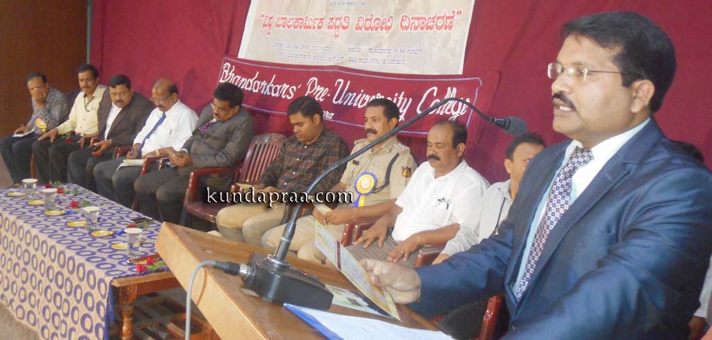 ಕುಂದಾಪುರ: ಕುಂದಾಪುರದ ಭಂಡಾರ್‌ಕಾರ‍್ಸ್ ಕಾಲೇಜಿನ ಆರ್.ಎನ್.ಶೆಟ್ಟಿ ಸಭಾಂಗಣದಲ್ಲಿ ಜಿಲ್ಲಾಡಳಿತ ಉಡುಪಿ ,ಜಿಲ್ಲಾ ಕಾನೂನು ಸೇವೆಗಳ ಪ್ರಾಧಿಕಾರ ಉಡುಪಿ, ಕಾರ್ಮಿಕ ಇಲಾಖೆ ಮತ್ತು ಜಿಲ್ಲಾ ಬಾಲ ಕಾರ್ಮಿಕರ ಯೋಜನಾ ಸಂಘ ಮತ್ತು ವಕೀಲರ ಸಂಘ ಉಡುಪಿ ಮತ್ತು ಭಂಡಾರ್‌ಕಾರ‍್ಸ್ ಆರ್ಟ್ಸ್ & ಸೈನ್ಸ್ ಕಾಲೇಜು ಕುಂದಾಪುರ ಇವರ ಸಂಯುಕ್ತ ಆಶ್ರಯದಲ್ಲಿ ವಿಶ್ವ ಬಾಲಕಾರ್ಮಿಕ ಪದ್ಧತಿ ವಿರೋಧಿ ದಿನಾಚರಣೆಯ ಕಾರ್ಯಕ್ರಮ ಜರುಗಿತು.