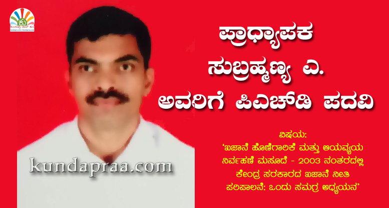 ಕುಂದಾಪುರ: ಕೊಟೇಶ್ವರದ ಶ್ರೀ ಕಾಳವಾರ ವರದರಾಜ ಎಂ. ಶೆಟ್ಟಿ ಸರಕಾರಿ ಪ್ರಥಮ ದರ್ಜೆ ಕಾಲೇಜಿನ ಸಹಾಯಕ ಪ್ರಾದ್ಯಾಪಕ ಹಾಗೂ ಅರ್ಥಶಾಸ್ತ್ರ ವಿಭಾಗದ ಮುಖ್ಯಸ್ಥ ಸುಬ್ರಹ್ಮಣ್ಯ ಎ. ಅವರು ಮಂಡಿಸಿದ ಅಧ್ಯಯನ ಪ್ರಬಂಧಕ್ಕೆ ಮಂಗಳೂರು ವಿಶ್ವವಿದ್ಯಾನಿಲಯ ಪಿಎಚ್‌ಡಿ ಪದವಿ ನೀಡಿದೆ.