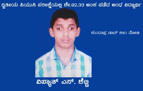 ಕುಂದಾಪುರ: ಅಂಧತ್ವ ಎನ್ನುವುದು ಶಾಪವಲ್ಲ. ಮನಸ್ಸು ಮಾಡಿದರೆ ಒಳಗಣ್ಣಿನಿಂದಲೇ ಪ್ರಪಂಚವನ್ನೇ ಗೆಲ್ಲಬಹುದು ಎಂಬುದಕ್ಕೆ ದ್ವಿತೀಯ ಪಿಯುಸಿಯಲ್ಲಿ ಡಿಸ್ಟಿಂಕ್ಷನ್ ಪಡೆದ ಅಂಧ ವಿದ್ಯಾರ್ಥಿ ವಿಖ್ಯಾತ ಎಸ್. ಶೆಟ್ಟಿ ಒಂದು ಉತ್ತಮ ನಿದರ್ಶನ.
