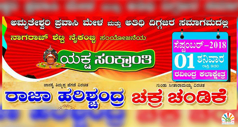 ಯಕ್ಷಗಾನ ಸಂಘಟಕ ನಾಗರಾಜ ಶೆಟ್ಟಿ ನೈಕಂಬ್ಳಿಯವರ ಸಂಯೋಜನೆಯಲ್ಲಿ ಸೆ.1ರ ಶನಿವಾರ ರಾತ್ರಿ 10ಗಂಟೆಗೆ ‘ಯಕ್ಷ ಸಂಕ್ರಾಂತಿ’ಯಲ್ಲಿ ರಾಜಾ ಹರೀಶ್ಚಂದ್ರ ಹಾಗೂ ಚಕ್ರ ಚಂಡಿಕೆ ಎಂಬ ಎರಡು ಪ್ರಸಂಗಗಳು ಪ್ರದರ್ಶನಗೊಳ್ಳಲಿದೆ.