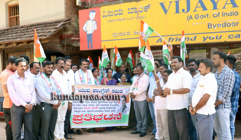 ಬೈಂದೂರು: ವಿಜಯ ಬ್ಯಾಂಕ್ ವಿಲೀನ ಪ್ರಕ್ರಿಯೆ ವಿರೋಧಿಸಿ ಬೈಂದೂರು ಯುವ ಕಾಂಗ್ರೆಸ್ ನೇತೃತ್ವದಲ್ಲಿ ವಿಜಯ ಬ್ಯಾಂಕ್ ಬೈಂದೂರು ಶಾಖೆಯ ಎದುರು ಪ್ರತಿಭಟನೆ ಜರುಗಿತು.