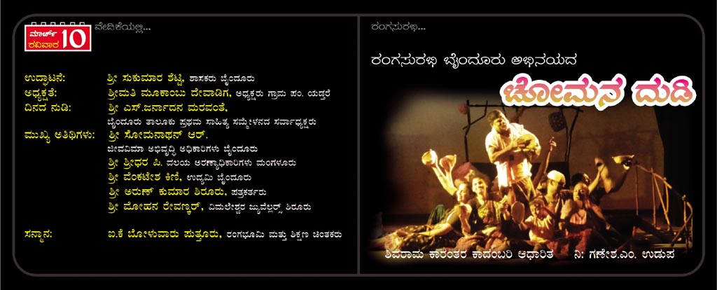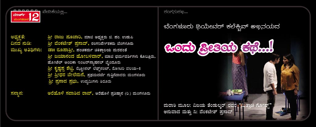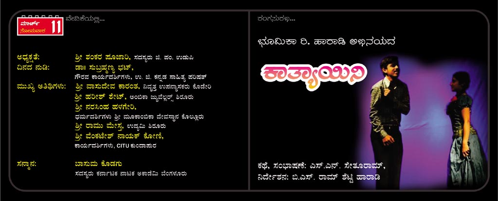 ಮಾರ್ಚ್ 10ರ ಭಾನುವಾರ ಡಾ. ಶಿವರಾಮ ಕಾರಂತರ ಕಾದಂಬರಿ ಆಧಾರಿತ ‘ಸುರಭಿ ರಿ. ಬೈಂದೂರು’ ಪ್ರಸ್ತುತಿಯ ಗಣೇಶ್ ಎಂ. ಉಡುಪಿ ನಿರ್ದೇಶನದ ನಾಟಕ ‘ಚೋಮನ ದುಡಿ’ ಪ್ರದರ್ಶನಗೊಳ್ಳಲಿದೆ. ಮಾರ್ಚ್ 11ರ ಸೋಮವಾರ ಎಸ್. ಎನ್. ಸೇತೂರಾಮ್ ಕಥೆ ಸಂಭಾಷಣೆ ಆಧಾರಿತ ಭೂಮಿಕಾ ಹಾರಾಡಿ ಪ್ರಸ್ತುತಿಯ, ಬಿ.ಎಸ್ ರಾಂ ಶೆಟ್ಟಿ ಹಾರಾಡಿ ನಿರ್ದೇಶನದ ’ಕಾತ್ಯಾಯಿನಿ’ ನಾಟಕ ಪ್ರದರ್ಶನಗೊಳ್ಳಲಿದ್ದು, ಮಾಚ್ 12 ಮಂಗಳವಾರ ವಿಜಯ ತೆಂಡುಲ್ಕರ್ರವರ ಮರಾಠಿ ಮೂಲಕದ ಕೃತಿ ಆಧಾರಿತ ವೆಂಕಟೇಶ ಪ್ರಸಾದ ಅನುವಾದ ಹಾಗೂ ನಿರ್ದೇಶನದ ’ಬೆಂಗಳೂರು ಥಿಯೇಟರ್ ಕಲೆಕ್ಟಿವ್’ ಪ್ರಸ್ತುತಿಯ ’ಒಂದು ಪ್ರೀತಿಯ ಕಥೆ’ ನಾಟಕ ಪ್ರದರ್ಶನಗೊಳ್ಳಲಿ ಎಂದು ಸಂಸ್ಥೆಯ ಪ್ರಕಟಣೆ ತಿಳಿಸಿದೆ.