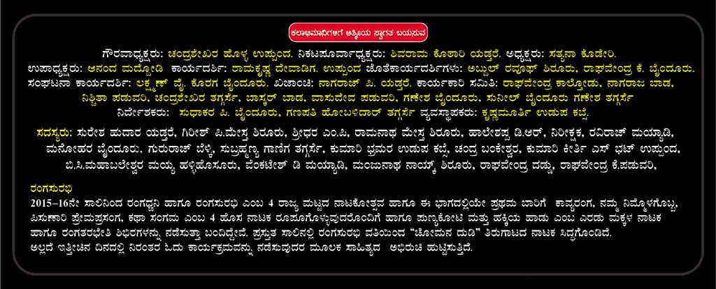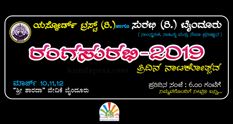 ಬೈಂದೂರು: ಇಲ್ಲಿನ ಯಸ್ಕೋರ್ಡ್ ಟ್ರಸ್ಟ್ ರಿ. ಹಾಗೂ ಸುರಭಿ ರಿ. ಬೈಂದೂರು ಆಶ್ರಯದಲ್ಲಿ ತ್ರಿದಿನ ನಾಟಕೋತ್ಸವ ರಂಗ ಸುರಭಿ – ೨೦೧೯ ಮಾರ್ಚ್ ೧೦ರಿಂದ ೧೨ವರೆಗೆ ಬೈಂದೂರಿನ ಶ್ರೀ ಶಾರದಾ ವೇದಿಕೆಯಲ್ಲಿ ಪ್ರತಿದಿನ ಸಂಜೆ ಗಂಟೆ ೬-೩೦ಕ್ಕೆ ಜರುಗಲಿದೆ.