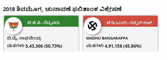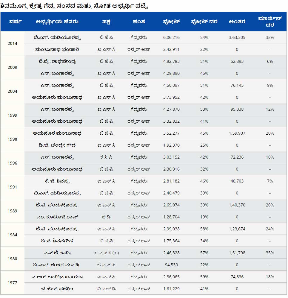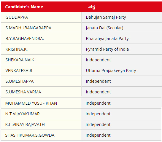 ಬಿ.ಎಸ್.ಯಡಿಯೂರಪ್ಪ ರಾಜ್ಯ ವಿಧಾನಸಭೆಗೆ ಆಯ್ಕೆಯಾದ ಕಾರಣ ತೆರವಾದ ಸ್ಥಾನಕ್ಕೆ ಕಳೆದ ವರ್ಷ ನವೆಂಬರ್ 3ರಂದು ಉಪ ಚುನಾವಣೆ ನಡೆದಿತ್ತು. ಅದರಲ್ಲಿ ಅವರ ಪುತ್ರ ಬಿ.ವೈ.ರಾಘವೇಂದ್ರ ಮತ್ತು ಮಾಜಿ ಮುಖ್ಯಮಂತ್ರಿ ದಿವಂಗತ ಬಂಗಾರಪ್ಪ ಅವರ ಪುತ್ರ ಮಧು ಬಂಗಾರಪ್ಪ ಅವರೇ ಎದುರಾಳಿಗಳಾಗಿದ್ದು, ರಾಘವೇಂದ್ರ ವಿಜಯಿಯಾಗಿದ್ದರು. ಇದೀಗ ಐದು ತಿಂಗಳು, ಇಪ್ಪತ್ತು ದಿನಗಳ ಬಳಿಕ ಇದೇ 23ರಂದು ಸಾರ್ವತ್ರಿಕ ಚುನಾವಣೆ ನಡೆಯುತ್ತಿದೆ. ಉಪ ಚುನಾವಣೆಯಲ್ಲಿ ಸ್ಪರ್ಧೆಗೆ ಸಂಬಂಧಿಸಿ ಅದೇ ವಿನ್ಯಾಸ ಈ ಬಾರಿಯೂ ಮುಂದುವರಿದಿದೆ.