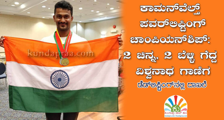 ಕುಂದಾಪುರ: ಕೆನಡಾದ ಸೆಂಟ್ ಜೋನ್ಸ್ನಲ್ಲಿ ನಡೆಯುತ್ತಿರುವ ಕಾಮನ್ವೆಲ್ತ್ ಅಂತರಾಷ್ಟ್ರೀಯ ಬೆಂಚ್ ಪ್ರೆಸ್ ಪವರ್ಲಿಫ್ಟಿಂಗ್ ಚಾಂಪಿಯನ್ಶಿಪ್ನಲ್ಲಿ ಕುಂದಾಪುರದ ವಿಶ್ವನಾಥ ಭಾಸ್ಕರ ಗಾಣಿಗ ಬಾಳಿಕೆರೆ 2 ಚಿನ್ನ ಹಾಗೂ 2 ಬೆಳ್ಳಿ ಪದಕವನ್ನು ಗೆಲ್ಲುವ ಮೂಲಕ ಡೆಡ್ ಲಿಫ್ಟ್ನಲ್ಲಿ ನೂತನ ದಾಖಲೆ ಬರೆದಿದ್ದಾರೆ.