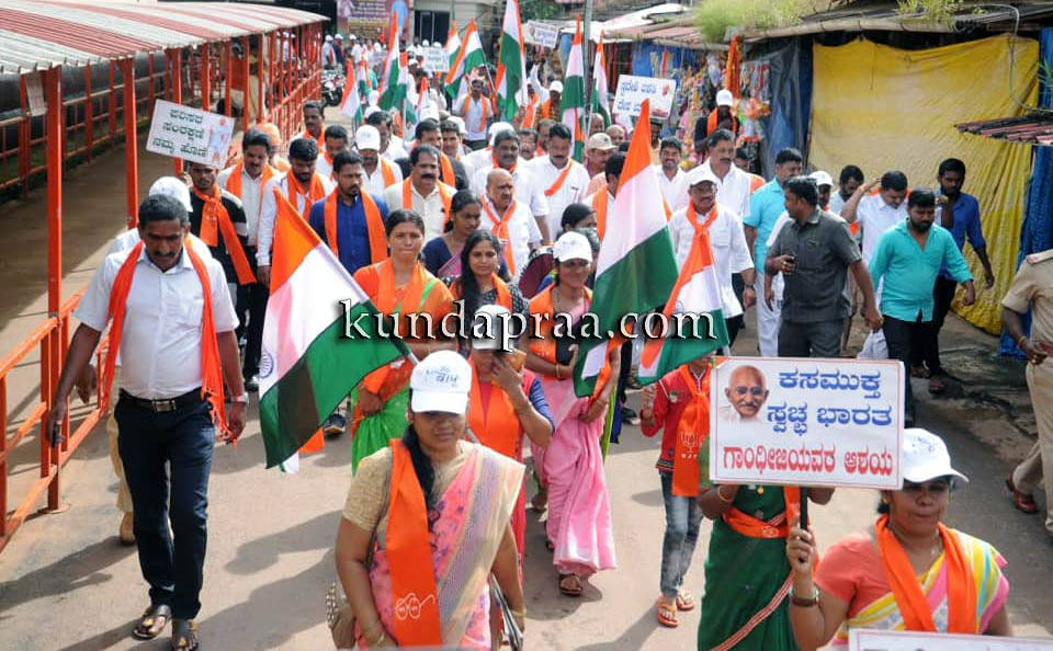 ಕುಂದಾಪುರ: ಮಹಾತ್ಮ ಗಾಂಧಿ ಜಯಂತಿಯ ೧೫೦ನೇ ವರ್ಷದ ಅಂಗವಾಗಿ ಸ್ವದೇಶಿ, ಸವರಾಜ್, ಸ್ವಾವಲಂಬಿ ಮತ್ತು ಸ್ವಚ್ಛ ಭಾರತ ಸಾಕಾರಕ್ಕಾಗಿ ಶಿವಮೊಗ್ಗ ಲೋಕಸಭಾ ಕ್ಷೇತ್ರ ವ್ಯಾಪ್ತಿಯಲ್ಲಿ ಹಮ್ಮಿಕೊಂಡ ೧೫೦ ಕಿ.ಮೀ ಪಾದಯಾತ್ರೆಯ ಭಾಗವಾಗಿ ಮೂರನೇ ದಿನ ಬೈಂದೂರು ವಿಧಾನಸಭಾ ಕ್ಷೇತ್ರದ ಕೊಲ್ಲೂರಿನಲ್ಲಿ ಪಾದಯಾತ್ರೆಗೆ ಚಾಲನೆ ನೀಡಲಾಯಿತು.