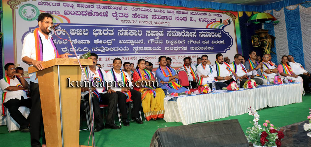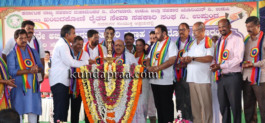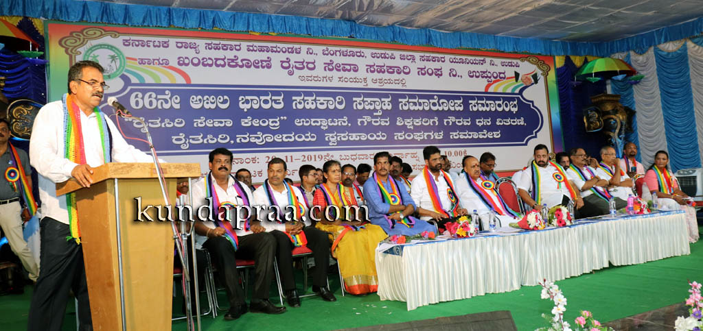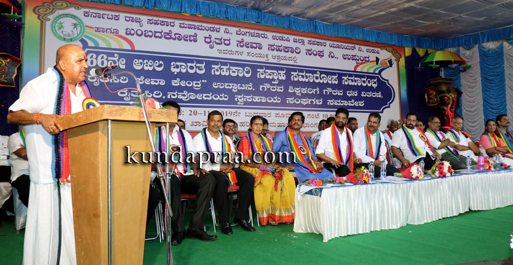 ಅವರು ಬುಧವಾರ ಕರ್ನಾಟಕ ರಾಜ್ಯ ಸಹಕಾರ ಮಹಾಮಂಡಲ ನಿ. ಬೆಂಗಳೂರು, ಉಡುಪಿ ಜಿಲ್ಲಾ ಸಹಕಾರ ಯೂನಿಯನ್ ನಿ. ಉಡುಪಿ ಹಾಗೂ ಖಂಬದಕೋಣೆ ರೈತರ ಸೇವಾ ಸಹಕಾರಿ ಸಂಘ ನಿ. ಉಪ್ಪುಂದ ಇವರುಗಳ ಸಂಯುಕ್ತ ಆಶ್ರಯದಲ್ಲಿ ಖಂಬದಕೋಣೆ ಕರ್ನಾಟಕ ಖಾವಿ ಯಾನೆ ಹರಿಕಾಂತ ಮಹಾಜನ ಸಭಾಂಗಣದಲ್ಲಿ ಜರುಗಿದ ೬೬ನೇ ಸಹಕಾರಿ ಸಪ್ತಾಹ ಸಮಾರೋಪ ಸಮಾರಂಭಕ್ಕೂ ಮುನ್ನ ಸಂಘದ ಖಂಬದಕೋಣೆ ಶಾಖೆಯಲ್ಲಿ ಆರಂಭಗೊಂಡ ರೈತಸಿರಿ ಸೇವಾ ಕೇಂದ್ರವನ್ನು ಉದ್ಘಾಟಿಸಿ ಬಳಿಕ ಮಾತನಾಡಿದರು.