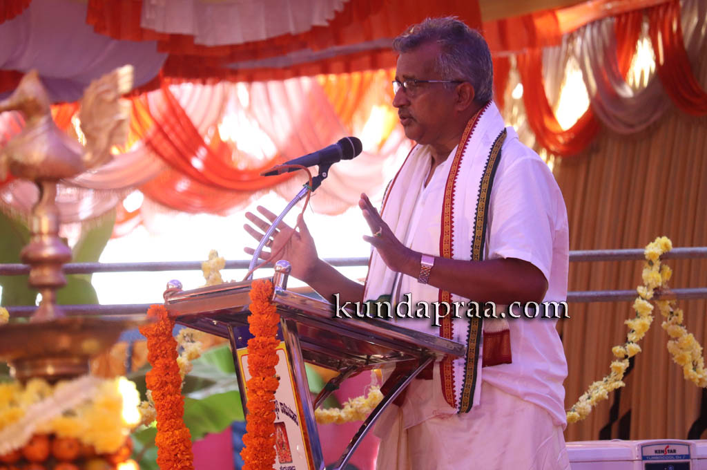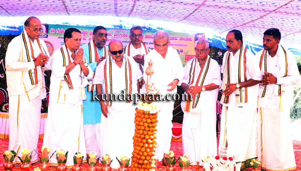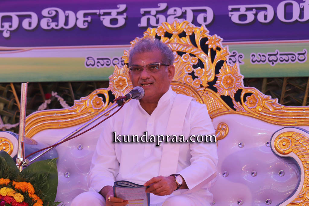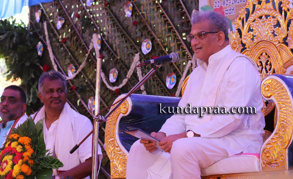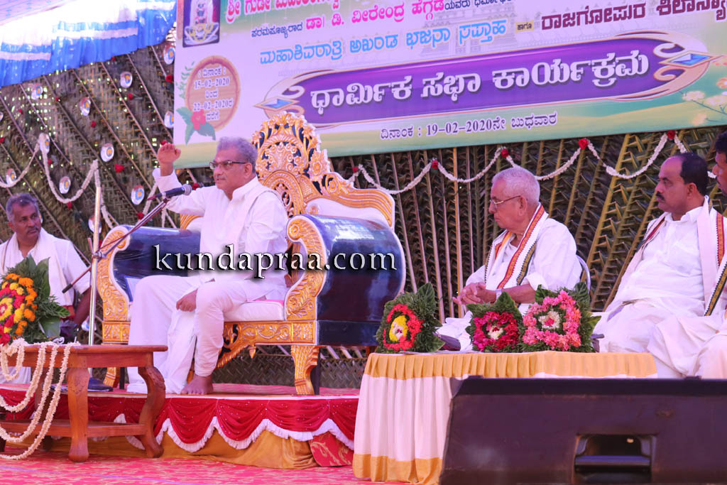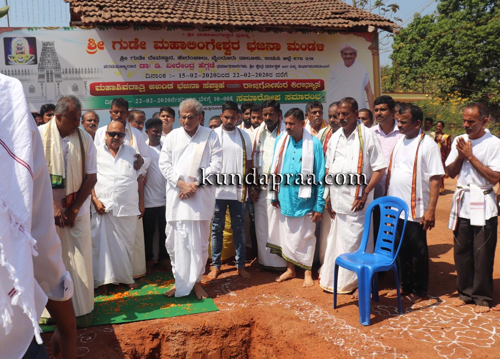 ಹೇರಂಜಾಲು ಗ್ರಾಮದ ಗುಡೇ ಮಹಾಲಿಂಗೇಶ್ವರ ಭಜನಾ ಮಂಡಳಿಯ ಆಶ್ರಯದಲ್ಲಿ ನಡೆಯುತ್ತಿರುವ ಮಹಾಶಿವರಾತ್ರಿ ಅಖಂಡ ಭಜನಾ ಸಪ್ತಾಹದ ನಡುವೆ ಮಹಾಲಿಂಗೇಶ್ವರ ದೇವಸ್ಥಾನಕ್ಕೆ ಅಂದಾಜು ಒಂದು ಕೋಟಿ ವೆಚ್ಚದಲ್ಲಿ ನಿರ್ಮಿಸಲು ಉದ್ದೇಶಿಸಿದ ರಾಜಗೋಪುರ ಕಾಮಗಾರಿಗೆ ಬುಧವಾರ ಶಿಲಾನ್ಯಾಸ ನೆರವೇರಿಸಿದ ಬಳಿಕ ನಡೆದ ಸಭೆಯಲ್ಲಿ ಅವರು ಮಾತನಾಡಿ ಕೀರ್ತನೆಯ ಮೂಲಕ ದೇವರನ್ನು ಒಲಿಸಿಕೊಂಡ ಹಲವು ದೃಷ್ಟಾಂತಗಳಿವೆ. ಅದು ಸಾಧ್ಯವಾಗಬೇಕಾದರೆ ದುಶ್ಚಟಗಳಿಂದ ದೂರರಾಗಿ, ದೀಕ್ಷಾಬದ್ಧರಾಗಿ ಅದನ್ನು ಅನುಸರಿಸಬೇಕು. ದೇವರನ್ನು ತನ್ನೊಳಗೆ ಆಹ್ವಾನಿಸಿಕೊಳ್ಳಬೇಕು ಎಂದರು.