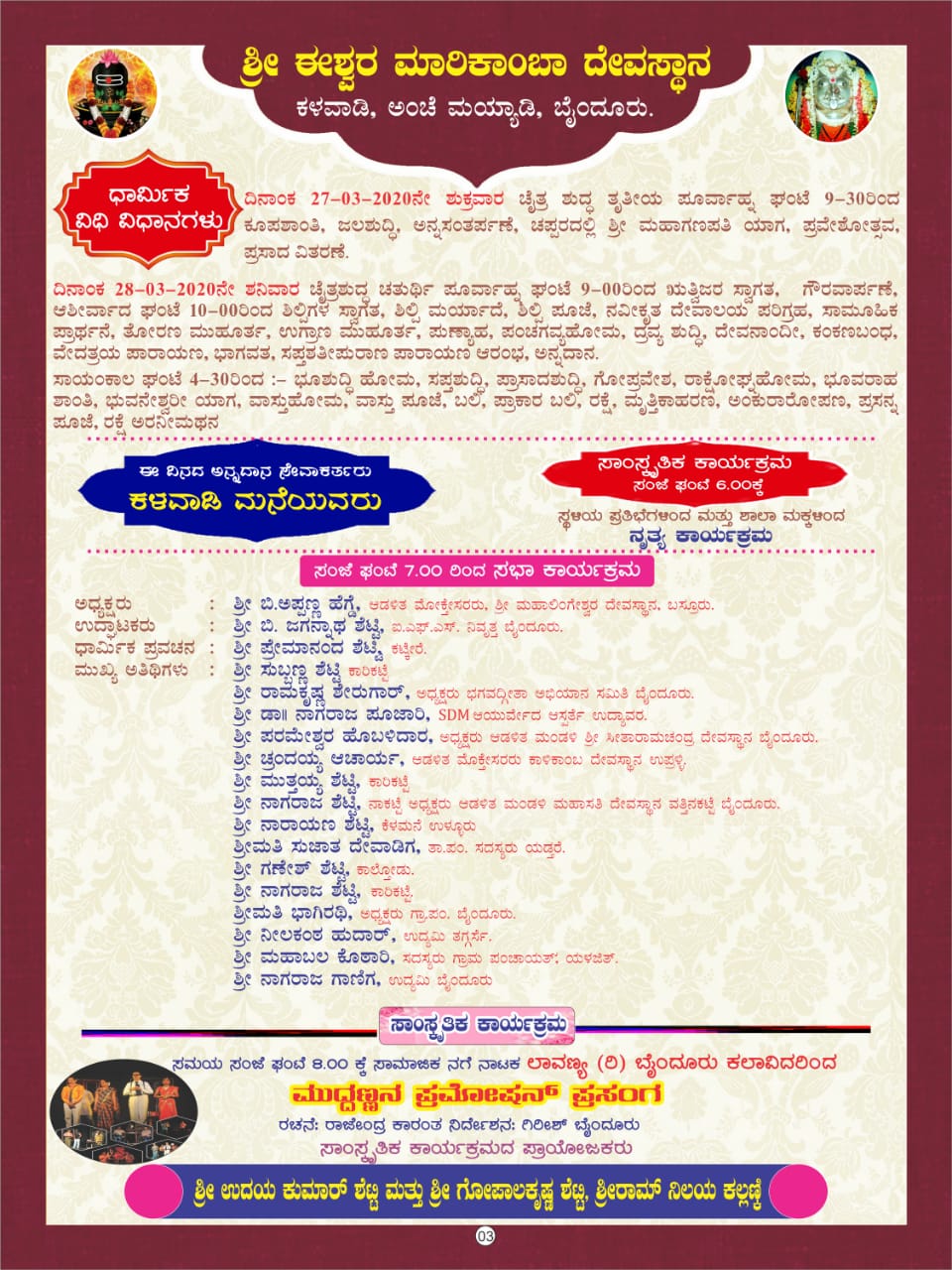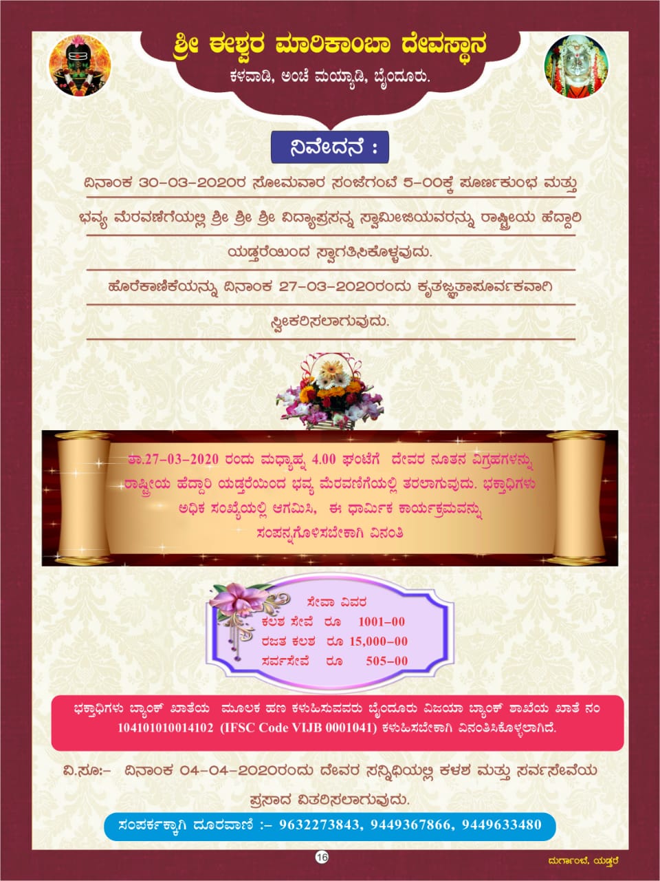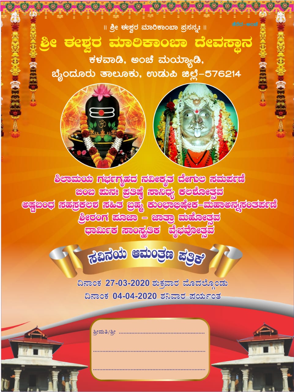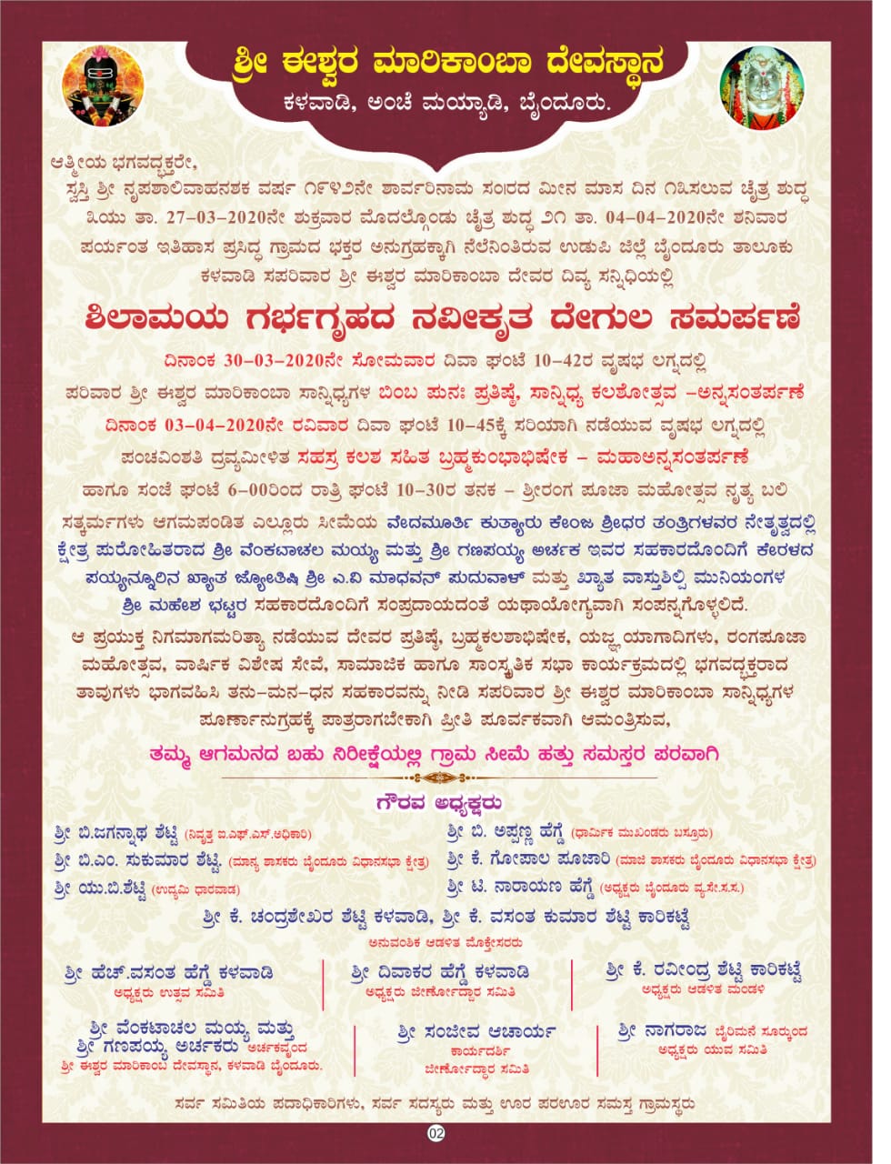 ಬೈಂದೂರು: ಕಳವಾಡಿ ಶ್ರೀ ಈಶ್ವರ ಮಾರಿಕಾಂಬ ದೇವಸ್ಥಾನದಲ್ಲಿ ಮಾ.೨೭ ರಿಂದ ಎ.೪ರ ವರೆಗೆ ನಡೆಯುವ ನವೀಕೃತ ಗರ್ಭಗುಡಿ ಮತ್ತು ನೂತನ ಶಿಲಾಮಯ ತೀರ್ಥ ಮಂಟಪ ಸಮರ್ಪಣೆ ಹಾಗೂ ಅಷಬಂಧ ಬ್ರಹ್ಮಕಲಶೋತ್ಸವದ ಆಮಂತ್ರಣ ಪತ್ರಿಕೆಯನ್ನು ನಿವೃತ್ತ ಅರಣ್ಯ ಸಂರಕ್ಷಣಾಧಿಕಾರಿ ಬಿ. ಜಗನ್ನಾಥ ಶೆಟ್ಟಿ ಬಿಡುಗಡೆಗೊಳಿಸಿದರು.