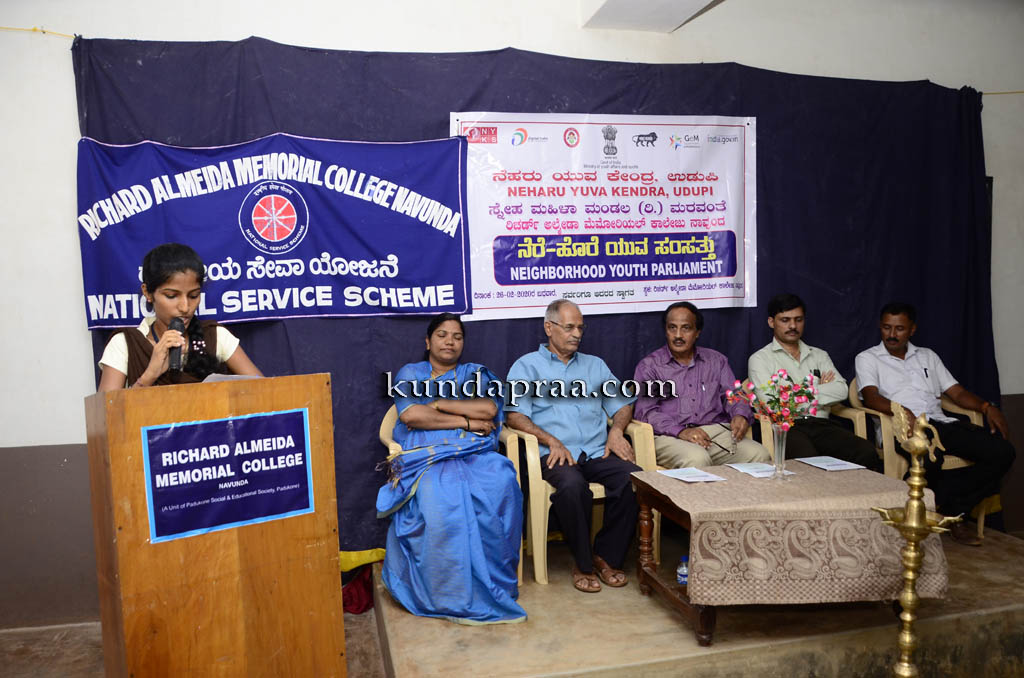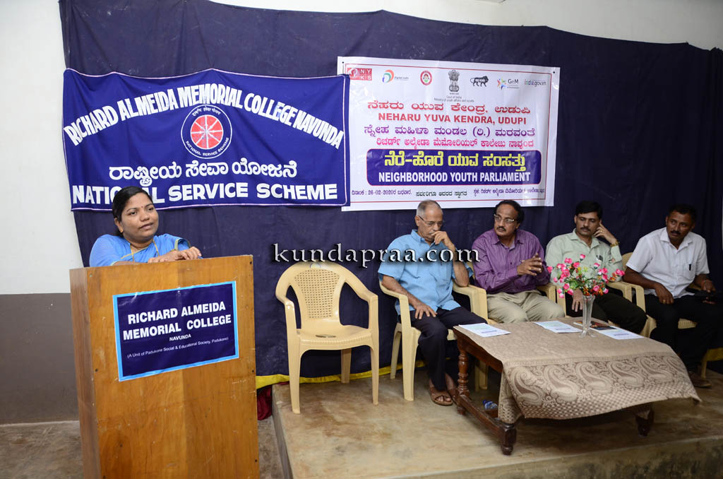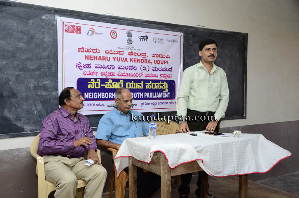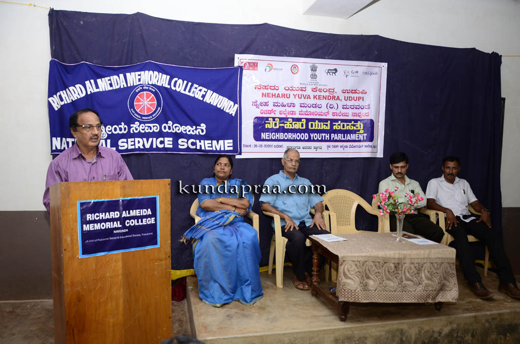 ಅವರು ನೆಹರು ಯುವ ಕೇಂದ್ರ ಉಡುಪಿ, ಸ್ನೇಹ ಮಹಿಳಾ ಮಂಡಲ ರಿ. ಮರವಂತೆ ಹಾಗೂ ರಿಚರ್ಡ್ ಅಲ್ಮೇಡಾ ಮೆಮೋರಿಯಲ್ ಕಾಲೇಜು ನಾವುಂದ ಇವುಗಳ ಸಂಯುಕ್ತಾಶ್ರಯದಲ್ಲಿ ಬುಧವಾರ ಕಾಲೇಜಿನಲ್ಲಿ ಹಮ್ಮಿಕೊಳ್ಳಲಾಗಿದ್ದ ನೆರೆ-ಹೊರೆ ಯುವ ಸಂಸತ್ತು ಉಪನ್ಯಾಸ ಕಾರ್ಯಕ್ರಮವನ್ನು ಉದ್ಘಾಟಿಸಿ ಮಾತನಾಡಿದರು. ಸ್ವಚ್ಛಭಾರತ ಹಾಗೂ ಜಲಸಂರಕ್ಷಣೆ ಇಂದಿನ ತುರ್ತಾಗಿದ್ದು, ಅದರೊಂದಿಗೆ ದೇಶದ ಆಡಳಿತದ ಒಳನೋಟಗಳನ್ನು ಅರ್ಥಮಾಡಿಕೊಂಡು ವೈಚಾರಿಕವಾಗಿ ಸದೃಢವಾಗುವುದು ಅಗತ್ಯವಾಗಿದೆ ಎಂದರು.