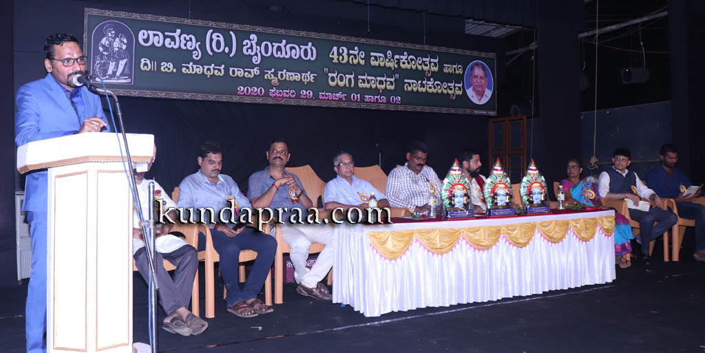 ಇಲ್ಲಿನ ಶಾರದಾ ಮಂಟಪದಲ್ಲಿ ಶನಿವಾರ ಆರಂಭವಾದ ಲಾವಣ್ಯ ಬೈಂದೂರು ಇದರ 43ನೆ ವಾರ್ಷಿಕೋತ್ಸವ ‘ರಂಗ ಲಾವಣ್ಯ-2020’ ಹಾಗೂ ಬಿ. ಮಾಧವ ರಾವ್ ಸ್ಮರಣೆಯ ಮೂರು ದಿನಗಳ ರಂಗಮಾಧವ ನಾಟಕೋತ್ಸವ ಉದ್ಘಾಟಿಸಿ ಮಾತನಾಡಿದರು.