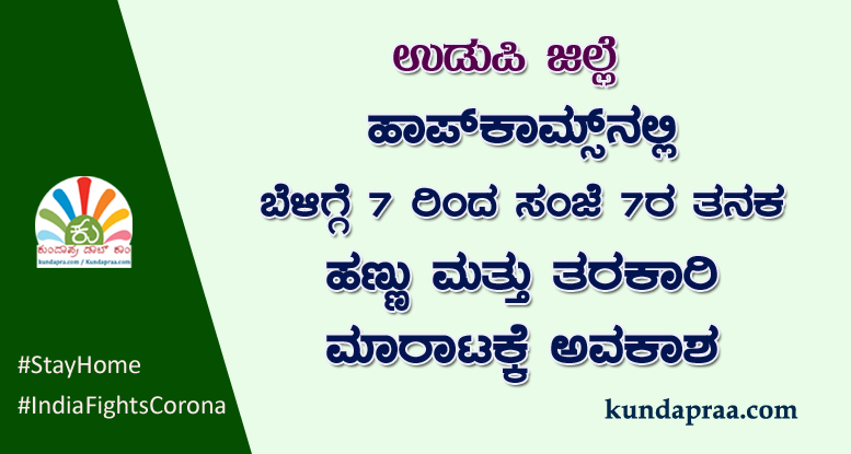 ಉಡುಪಿ ಜಿಲ್ಲೆಯಲ್ಲಿನ ಉಡುಪಿ ನಗರ, ಉಪ್ಪುಂದ ಹಾಗೂ ಕಾರ್ಕಳ ಆಸ್ಪತ್ರೆ ಆವರಣದಲ್ಲಿರುವ ಹಾಪ್ ಕಾಮ್ಸ್ ಮಳಿಗೆಗಳನ್ನು ಅಗತ್ಯ ಮುಂಜಾಗೃತಾ ಕ್ರಮಗಳೊಂದಿಗೆ ಕನಿಷ್ಠ ಸಿಬ್ಬಂದಿಯೊಂದಿಗೆ ತೆರೆಯುವುದು ಹಾಗೂ ಮಳಿಗೆಯಲ್ಲಿ ಕೆಲಸ ನಿರ್ವಹಿಸುವ ಸಿಬ್ಬಂದಿಯವರಿಗೆ ಕೋವಿಡ್-19 ಸೊಂಕು ತಗಲಿರುವುದಿಲ್ಲ ಹಾಗೂ ಸದರಿ ರೋಗ ಲಕ್ಷಣಗಳಿರುವುದಿಲ್ಲ ಎಂಬ ಬಗ್ಗೆ ದೃಢೀಕರಿಸಿಕೊಂಡು ಅವರಿಂದ ಸೇವೆ ಪಡೆದುಕೊಳ್ಳಬೇಕು.