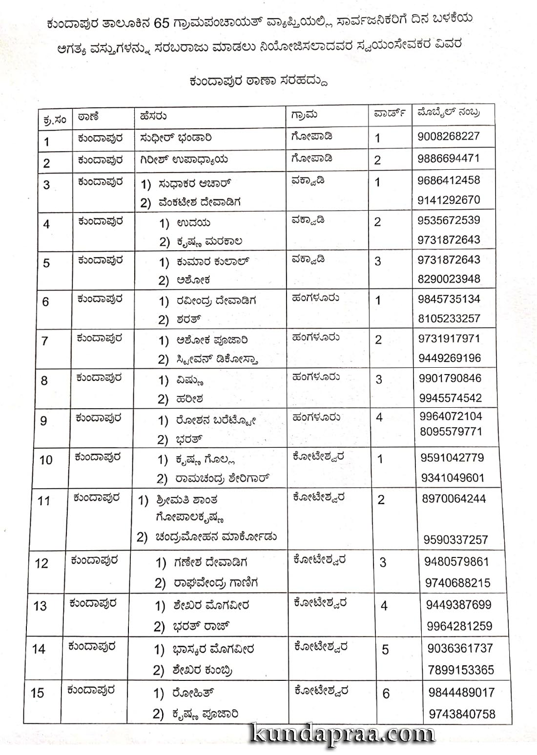 ಈ ಬಗ್ಗೆ ಕುಂದಾಪುರ ಪೊಲೀಸ್ ಉಪವಿಭಾಗದ ಎಎಸ್ಪಿ ಹರಿರಾಂ ಶಂಕರ್ ಮಾಹಿತಿ ನೀಡಿದ್ದು, ಉಡುಪಿ ಜಿಲ್ಲಾ ಪಂಚಾಯತ್ ಸಿಇಓ ಪ್ರೀತಿ ಗೆಹ್ಲೋಟ್ ಅವರ ಮಾರ್ಗದರ್ಶನದಲ್ಲಿ ಕುಂದಾಪುರ ಹಾಗೂ ಬೈಂದೂರು ತಾಲೂಕು ಇಓ, ಗ್ರಾಮ ಪಂಚಾಯತಿಗಳ ಪಿಡಿಓ ಹಾಗೂ ಪ್ರತಿ ವಾರ್ಡಿನ ಒಬ್ಬರು ಸದಸ್ಯರನ್ನೊಳಗೊಂಡ ಕೋವಿಡ್ -19 ಟಾಸ್ಕ್ ಪೋರ್ಸ್ ಮೂಲಕ ಮನೆ ಬಾಗಿಲಿಗೆ ಅಗತ್ಯ ವಸ್ತುಗಳನ್ನು (ತರಕಾರಿ & ದಿನಸಿ) ತಲುಪಿಸಲಾಗುತ್ತದೆ.