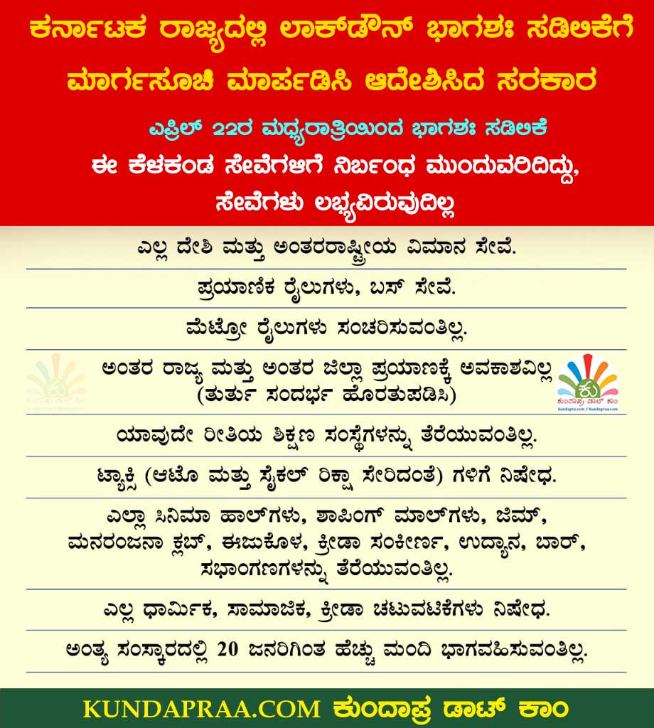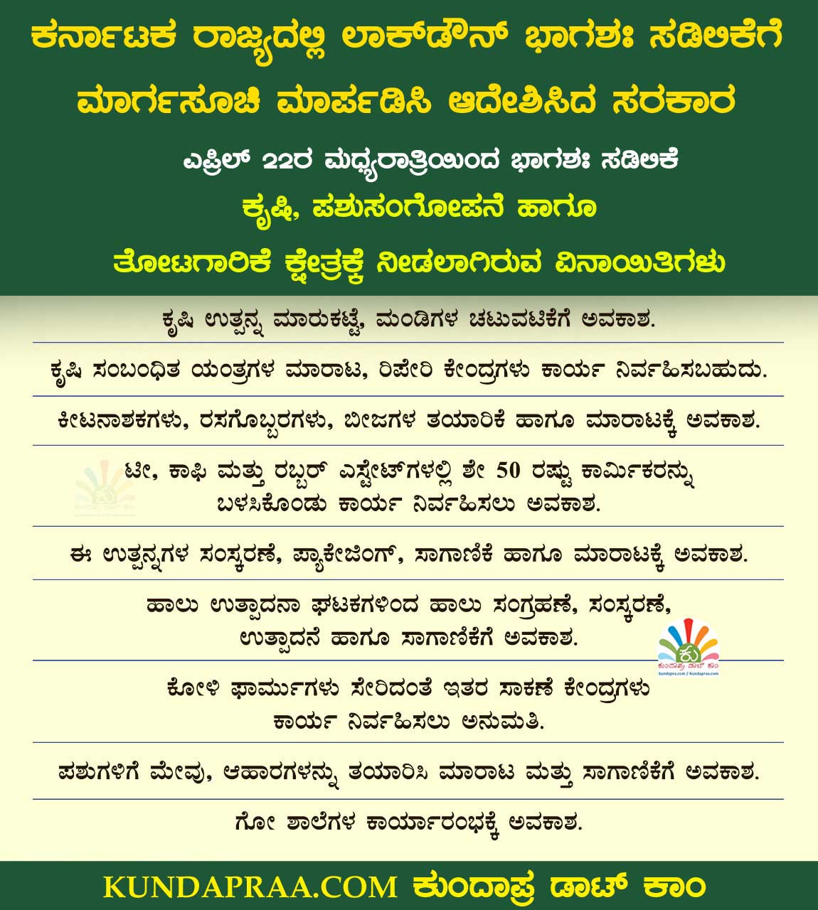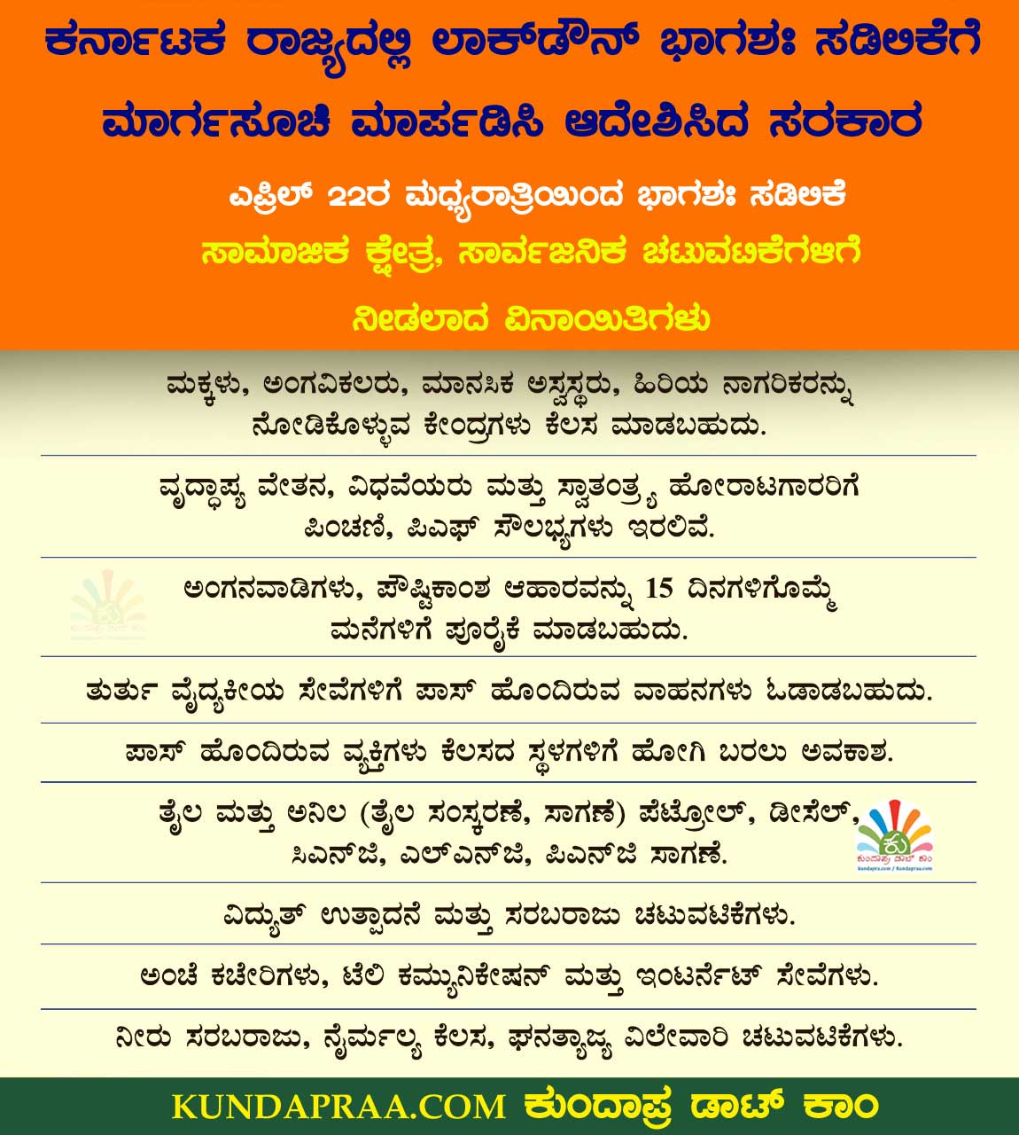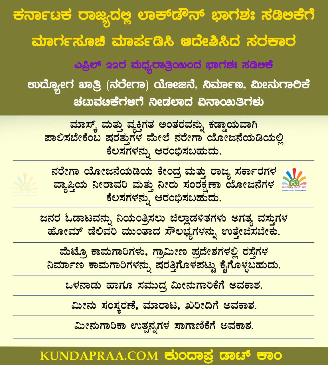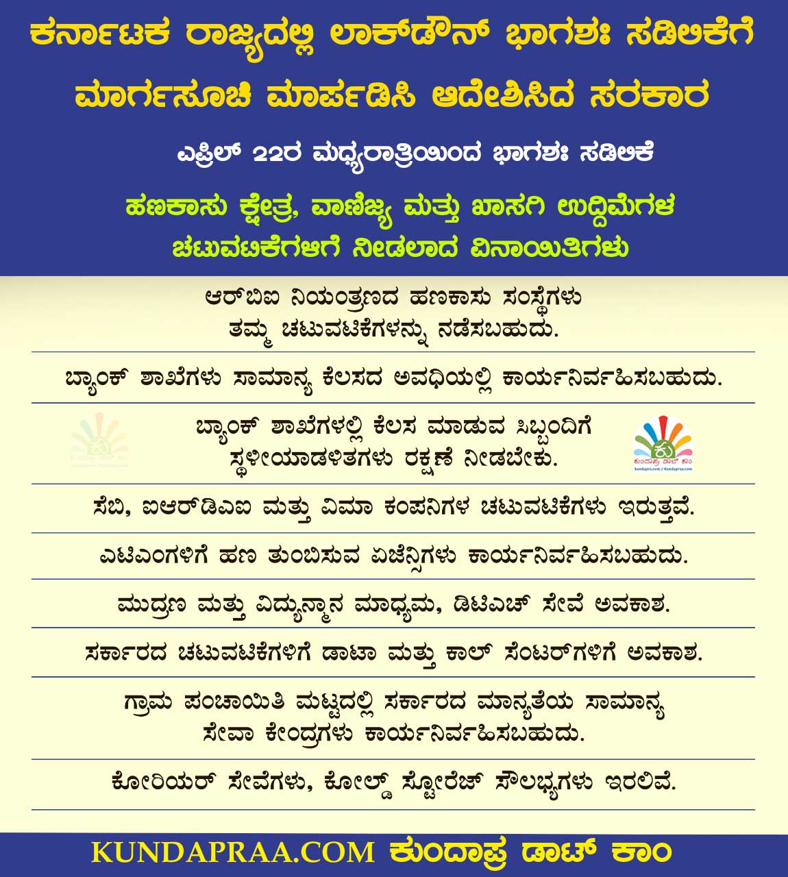 ಉಡುಪಿ: ಕರ್ನಾಟಕ ರಾಜ್ಯದಲ್ಲಿ ಲಾಕ್ ಡೌನ್ ಸಡಿಲಿಕೆ ಕುರಿತು ಕರ್ನಾಟಕ ಸರ್ಕಾರ ಅಧಿಕೃತ ಆದೇಶ ಹೊರಡಿಸಿದ್ದು, ಎ.22ರ ಮಧ್ಯರಾತ್ರಿಯಿಂದಲೇ ಭಾಗಶಃ ಜಾರಿಯಾಗಲಿದೆ.