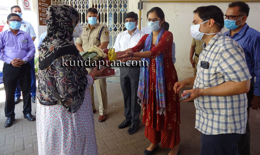 ಭಟ್ಕಳಕ್ಕೆ ಹೊರಟು ನಿಂತಿದ್ದ ಗರ್ಭಿಣಿಗೆ ಜಿಲ್ಲಾಡಳಿತದ ಪರವಾಗಿ ಉಡುಪಿ ಸಿಇಓ ಪ್ರೀತಿ ಗೆಹ್ಲೋಟ್ ಅವರು ಮಲ್ಲಿಗೆ ಹೂವು, ಸಿಹಿ ತಿಂಡಿ, ಹಣ್ಣುಗಳಿದ್ದ ತಟ್ಟೆಯನ್ನು ನೀಡಿ ಬೀಳ್ಕೊಟ್ಟರು. ಈ ಸಂದರ್ಭ ಜಿಲ್ಲಾಧಿಕಾರಿ ಜಿ. ಜಗದೀಶ್, ಪೊಲೀಸ್ ವರಿಷ್ಠಾಧಿಕಾರಿ ಎನ್. ವಿಷ್ಣುವರ್ಧನ್, ಡಿಹೆಚ್ಓ ಡಾ. ಸುದೀರ್ ಚಂದ್ರ ಸೂಡಾ, ಜಿಲ್ಲಾ ಕೋವಿಡ್ ನೋಡೆಲ್ ಅಧಿಕಾರಿ ಡಾ. ಪ್ರಶಾಂತ್ ಭಟ್, ಜಿಲ್ಲಾ ಸರ್ವೇಕ್ಷಣಾಧಿಕಾರಿ ಡಾ. ವಾಸುದೇವ ಉಪಾಧ್ಯಾಯ, ಡಾ. ಪ್ರೇಮಾನಂದ್ , ಕೆಎಂಸಿ ಯ ವೈದ್ಯಕೀಯ ಅಧೀಕ್ಷಕ ಡಾ.ಅವಿನಾಶ್ ಶೆಟ್ಟಿ, ಕೋವಿಡ್ ಆಸ್ಪತ್ರೆಯ ಡಾ. ಶಶಿ ಕಿರಣ್ ಹಾಗೂ ಕೋವಿಡ್ ಆಸ್ಪತ್ರೆಯ ಸಿಬ್ಬಂದಿ ಉಪಸ್ಥಿತರಿದ್ದರು.