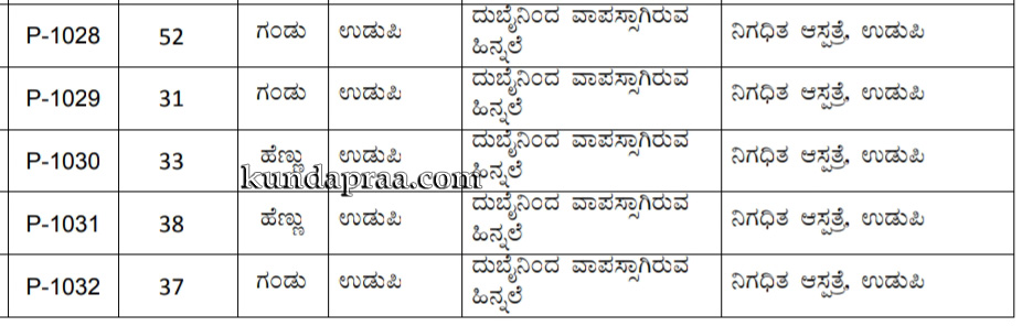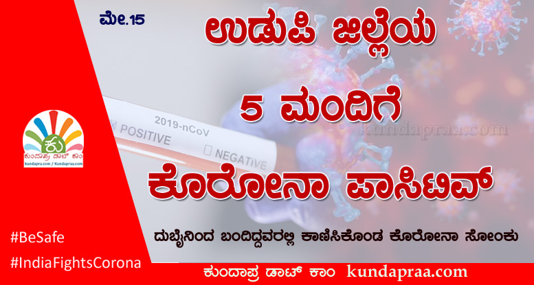 ದುಬೈನಿಂದ ಆಗಮಿಸಿದ ಉಡುಪಿಯ 46 ಮಂದಿಯನ್ನುಉಡುಪಿಯ ಹೋಟೆಲ್ನಲ್ಲಿ ಕ್ವಾರಂಟೈನಲ್ಲಿರಿಸಿ ಅವರ ಗಂಟಲು ದ್ರವವನ್ನು ಪರೀಕ್ಷೆಗೆ ಕಳುಹಿಸಲಾಗಿತ್ತು. ಅದರ ವರದಿ ದೊರೆತಿದ್ದು, ಐದು ಮಂದಿಗೆ ಪಾಸಿಟಿವ್ ದೃಢವಾಗಿದೆ. ಅವರನ್ನು ಉಡುಪಿಯ ಕೋವಿಡ್ ಆಸ್ಪತ್ರೆಗೆ ದಾಖಲಿಸಲಾಗಿದೆ.