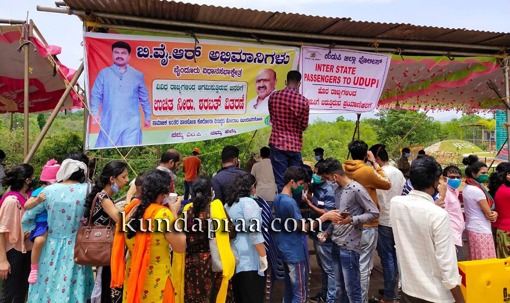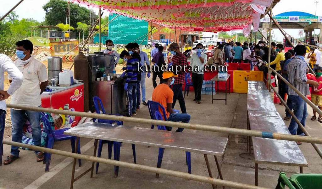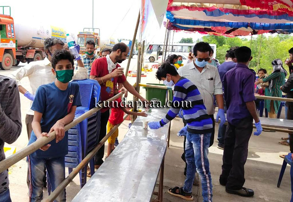 ಬೈಂದೂರು: ಇಲ್ಲಿನ ಶಿರೂರು ಟೋಲ್ಗೇಟ್ ಬಳಿಯ ಕೋವಿಡ್-19 ತಪಾಸಣಾ ಕೇಂದ್ರದಲ್ಲಿ ಹೊರರಾಜ್ಯಗಳಿಂದ ಬರುತ್ತಿರುವ ಜನರಿಗಾಗಿ ಸಂಸದ ಬಿ. ವೈ. ರಾಘವೇಂದ್ರ ಅವರ ನಿರ್ದೇಶನದಂತೆ ಬಿವೈಆರ್ ಅಭಿಮಾನಿಗಳು ಬಳಗದ ಮೂಲಕ ಉಚಿತವಾಗಿ ಜ್ಯೂಸ್ ಹಾಗೂ ಕುಡಿಯುವ ನೀರಿನ ವ್ಯವಸ್ಥೆ ಕಲ್ಪಿಸಲಾಗಿದೆ.