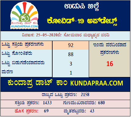 ► ಉಡುಪಿ ಜಿಲ್ಲೆಯಲ್ಲಿ ಭಾನುವಾರ 23 ಕೊರೋನಾ ಪಾಸಿಟಿವ್ – https://kundapraa.com/?p=37842 .